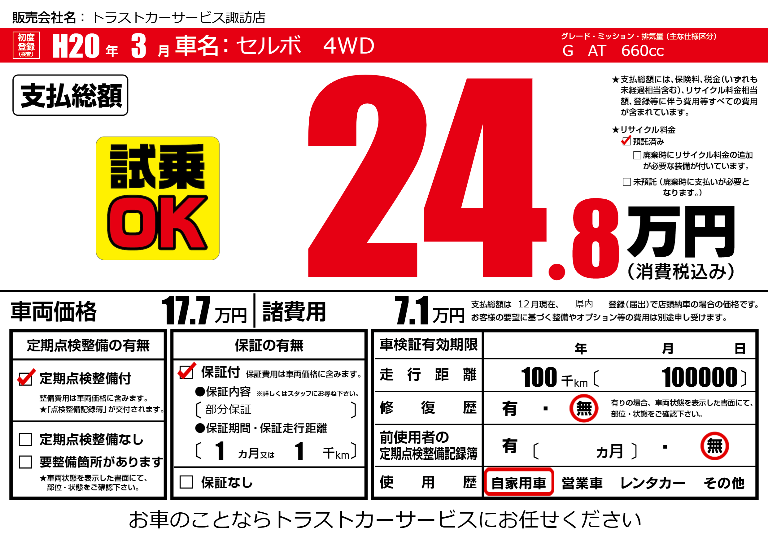 | 車名 | セルボ 4WD | グレード ミッション 排気量 |