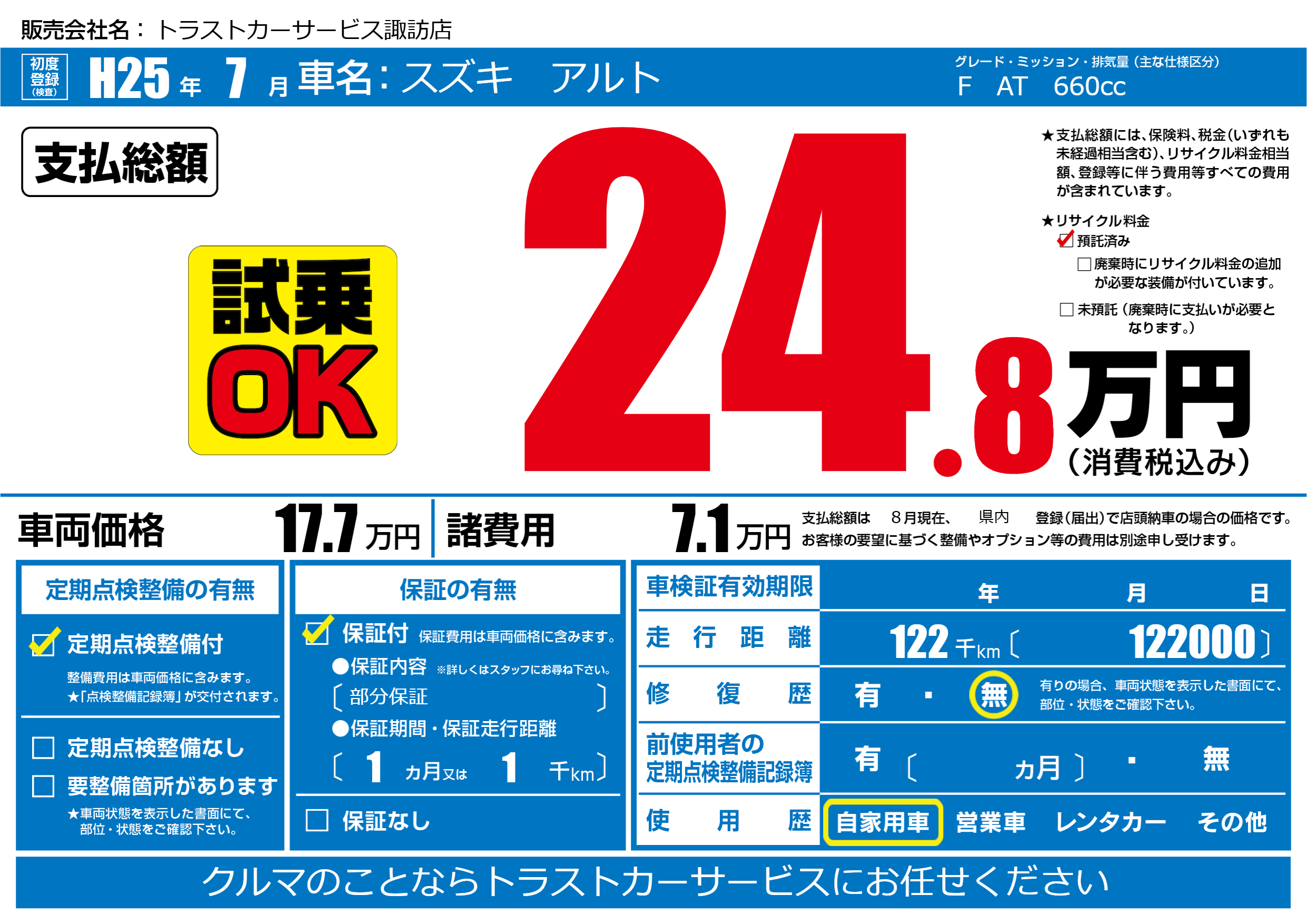 | 車名 | スズキ アルト | グレード ミッション 排気量 |