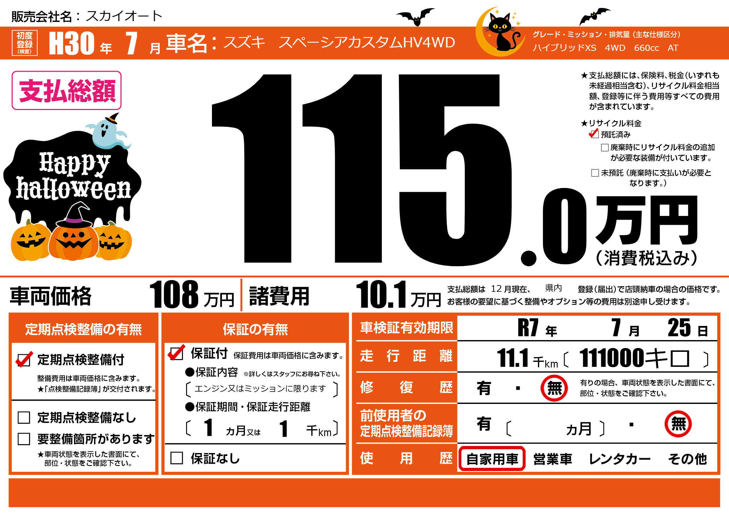 | 走行キロ | 1.1万km | 初年度登録 | H30年7月 |