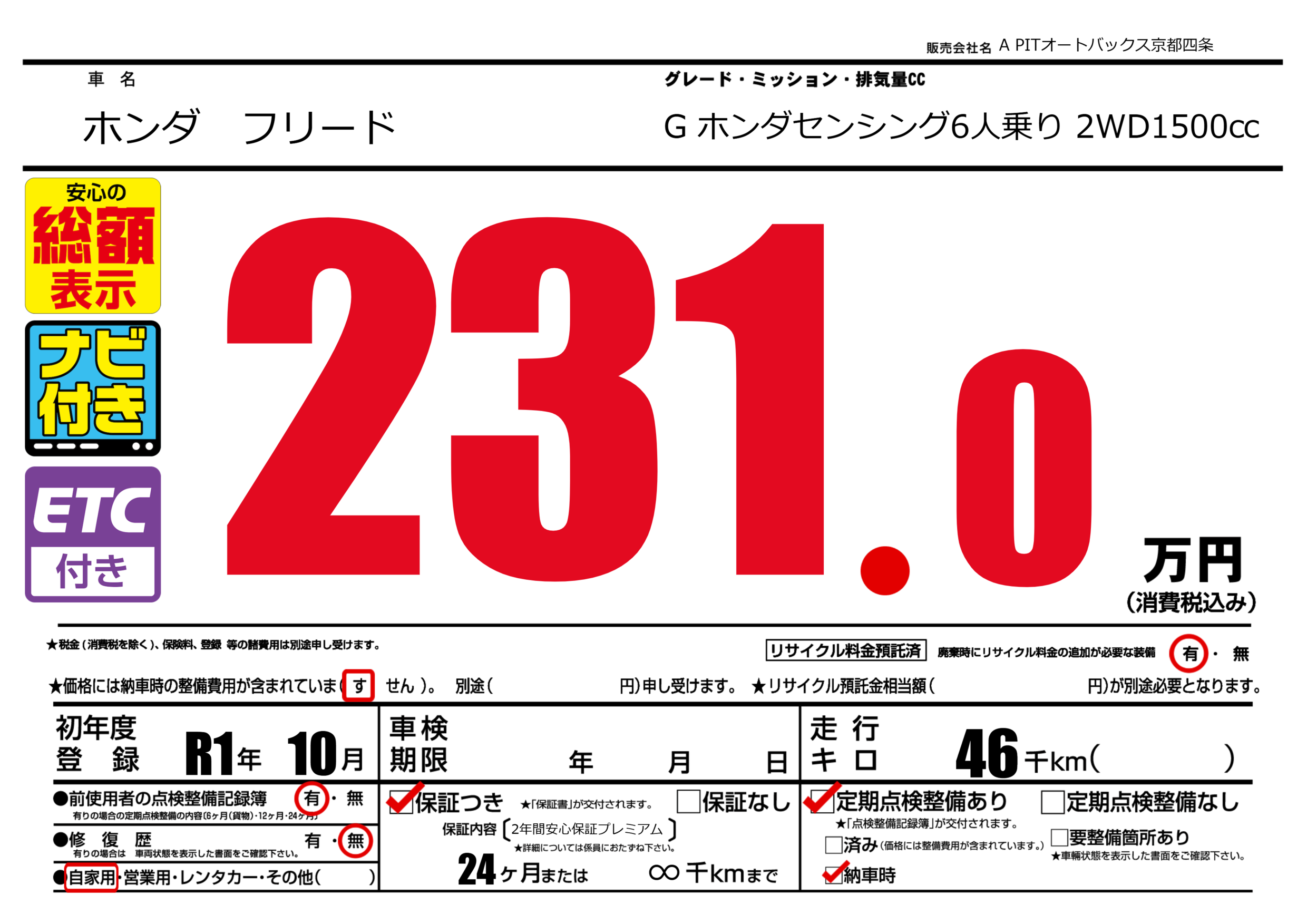| 車名 | ホンダ フリード | グレード ミッション 排気量 |