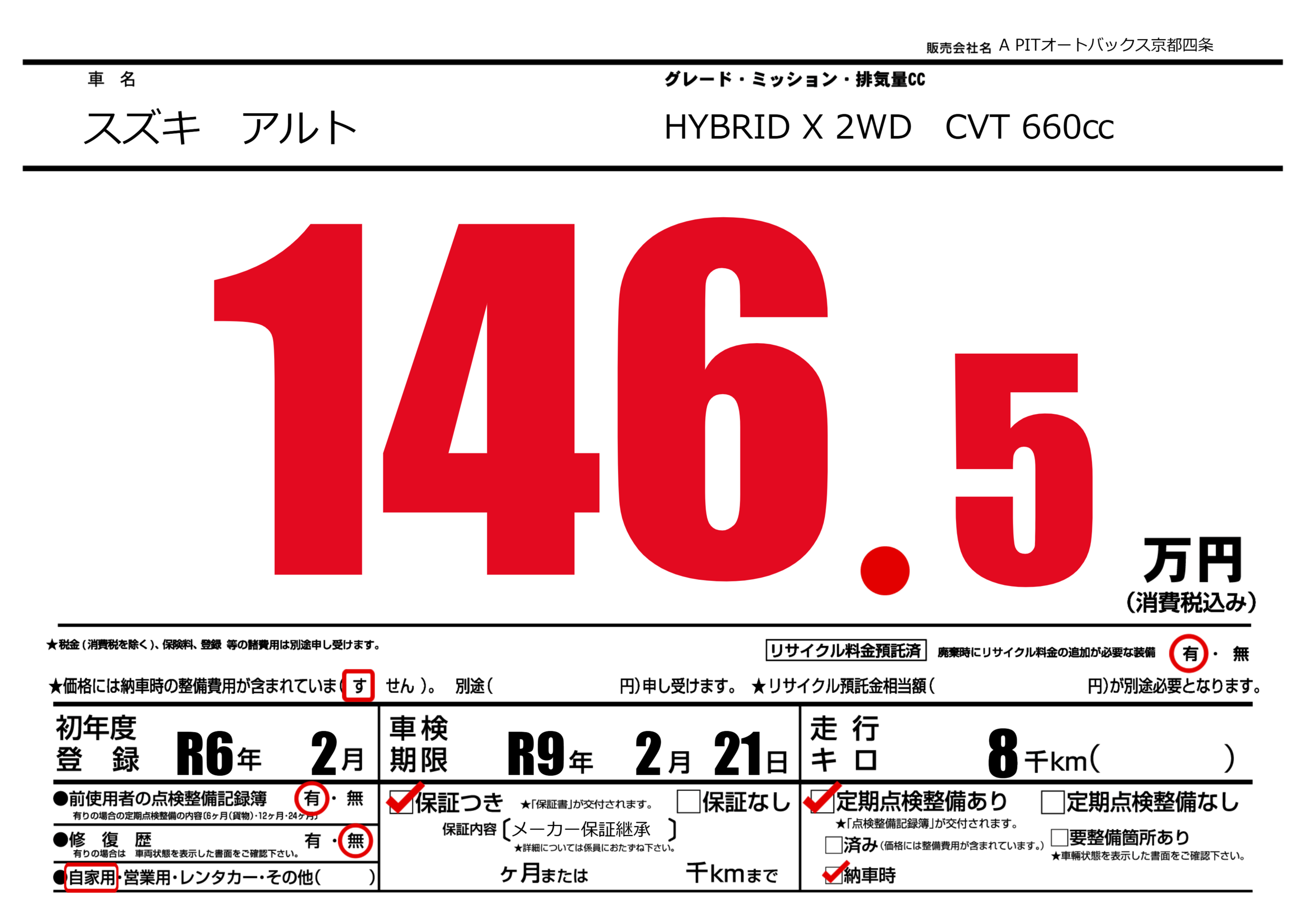 保証なし 保証内容(メーカー保証継承) ---ヶ月または()千kmまで |