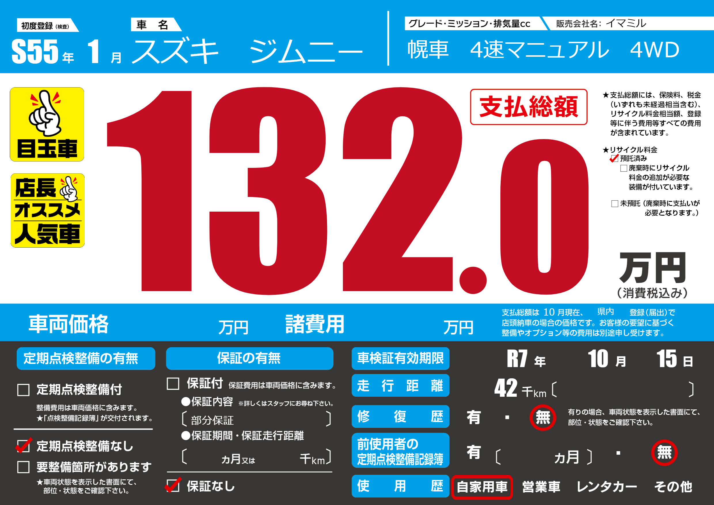 | 走行キロ | 4.2万km | 初年度登録 | S55年1月 |
