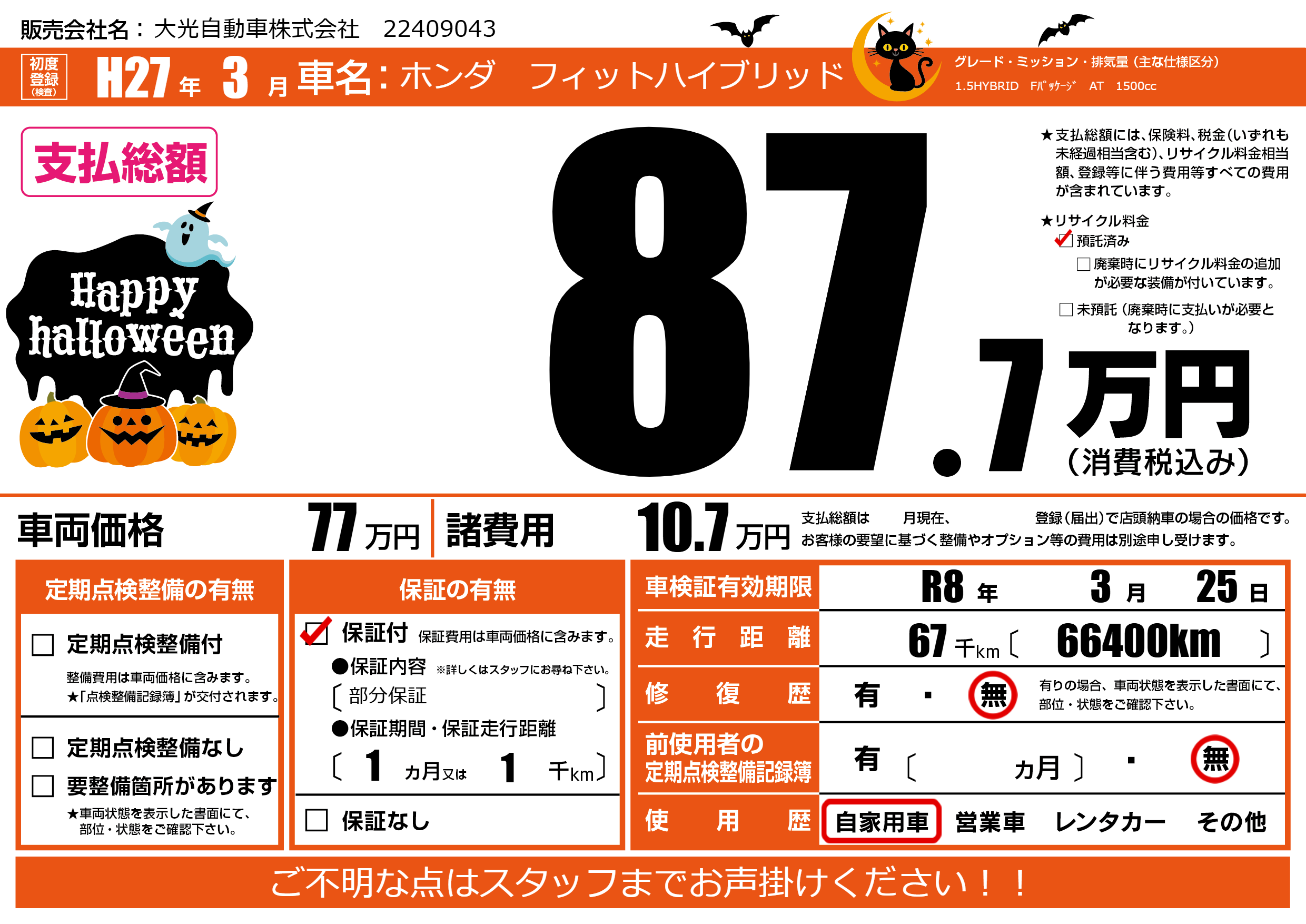 | 走行キロ | 6.7万km | 初年度登録 | H27年3月 |