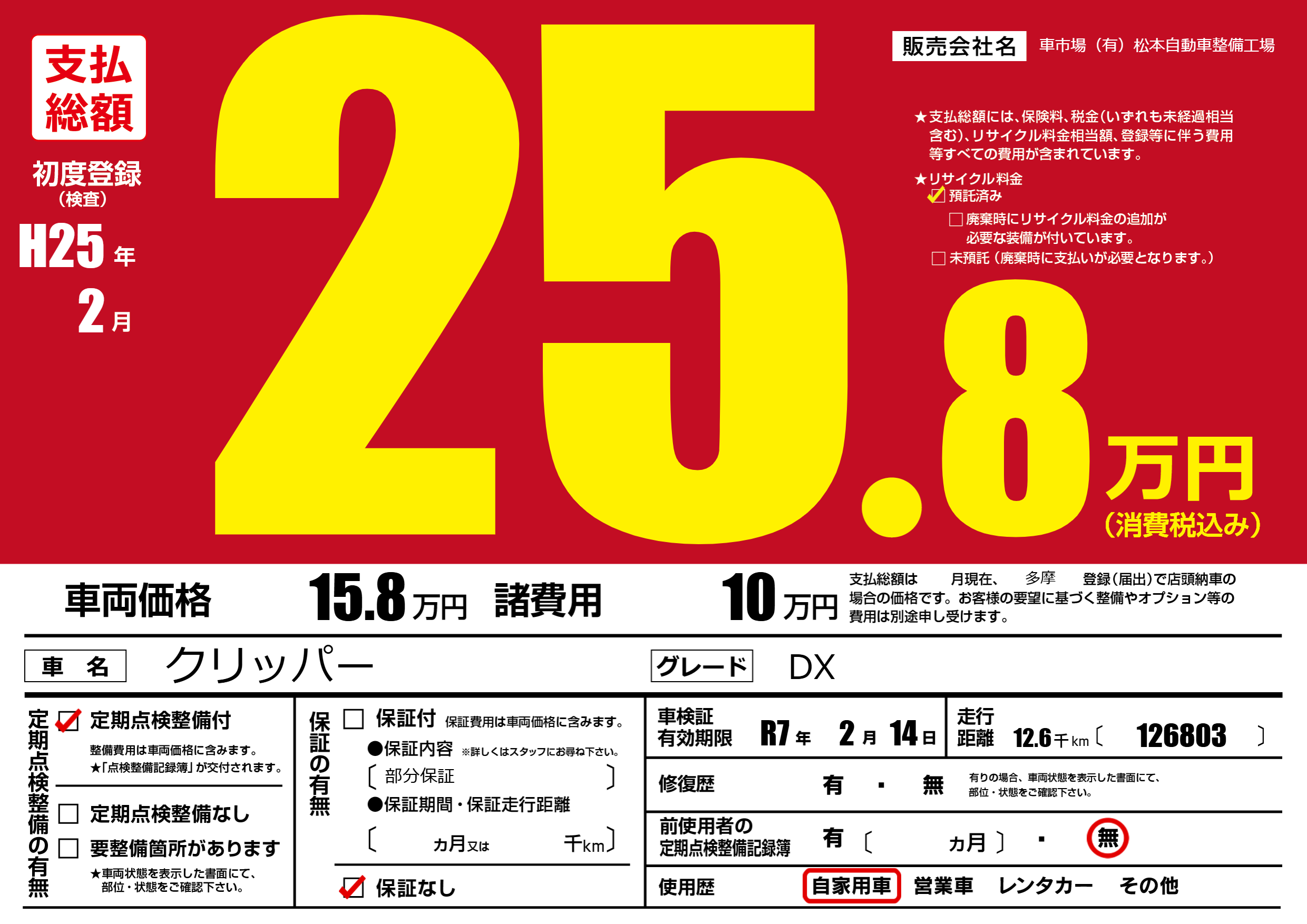 | 走行キロ | 1.2万km | 初年度登録 | H25年2月 |
