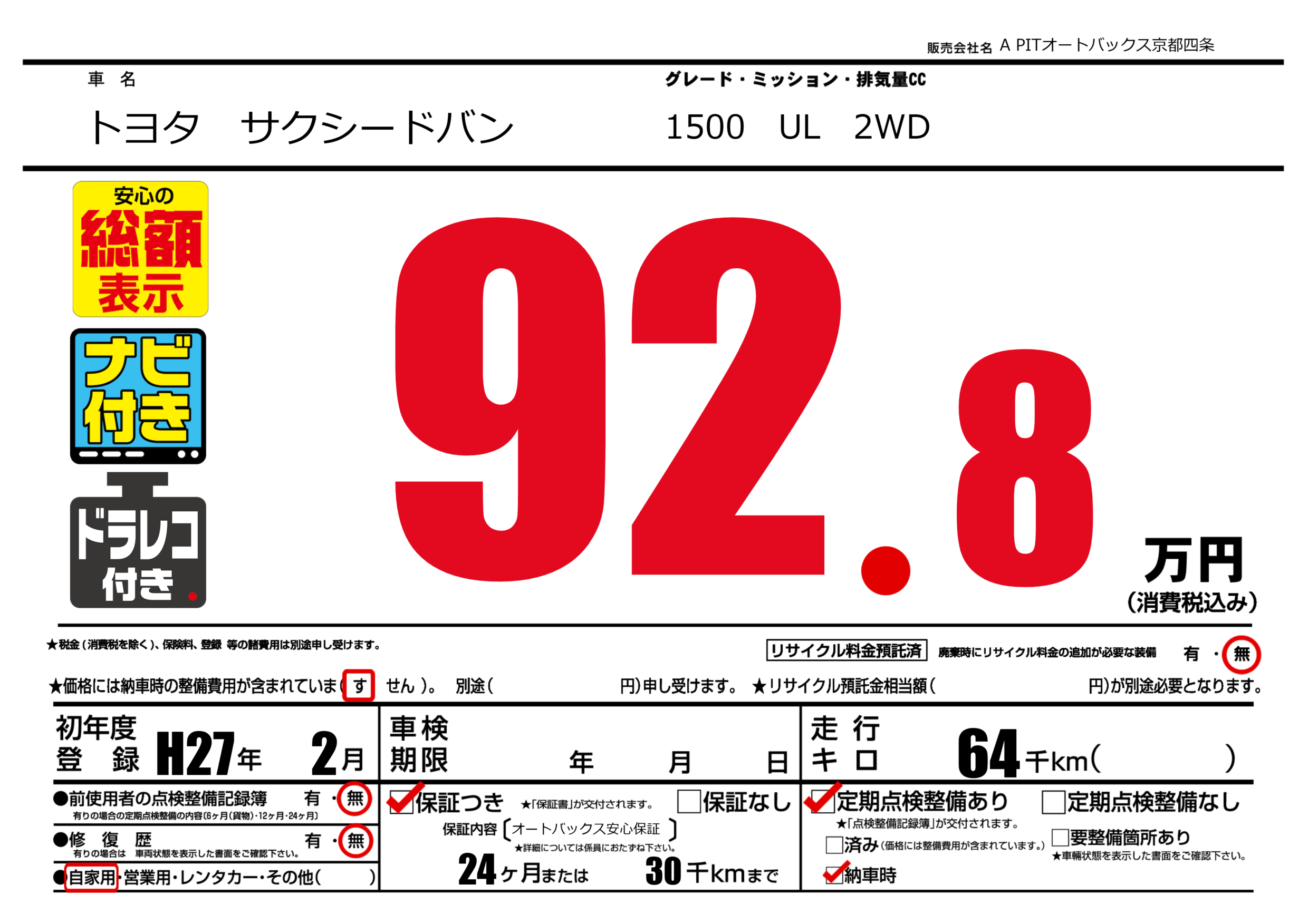 | 車名 | トヨタ サクシードバン | グレード ミッション 排気量 |