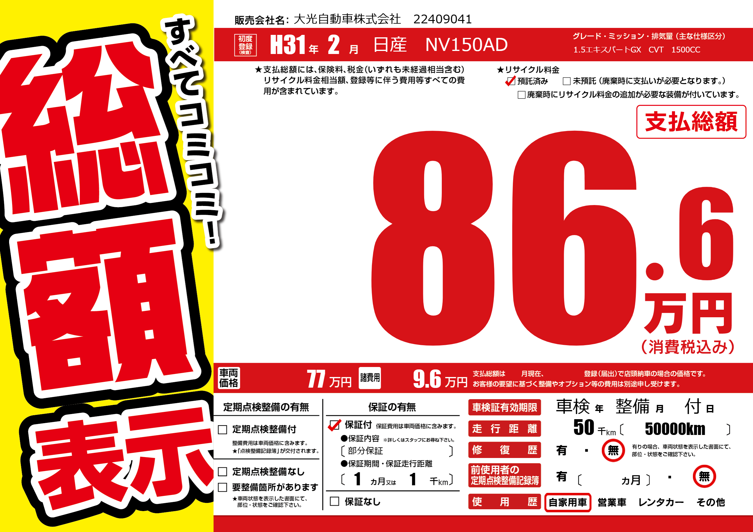 | 走行キロ | 5万km | ||