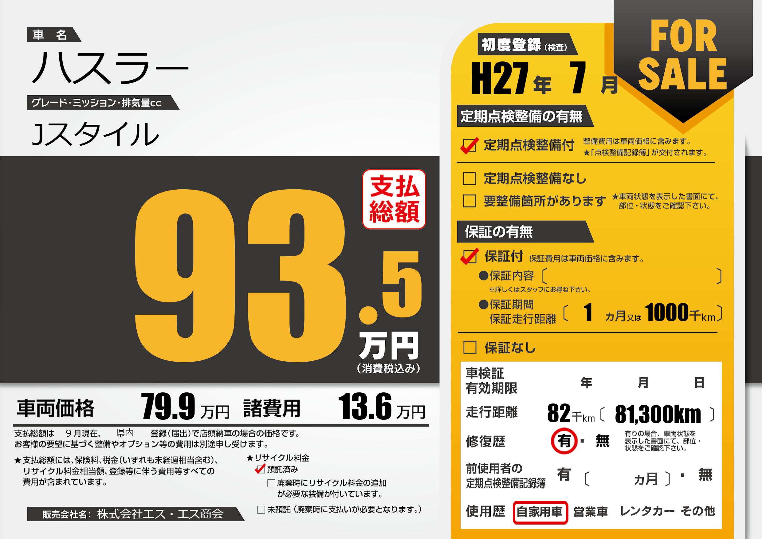 | 車名 | ハスラー | グレード ミッション 排気量 |