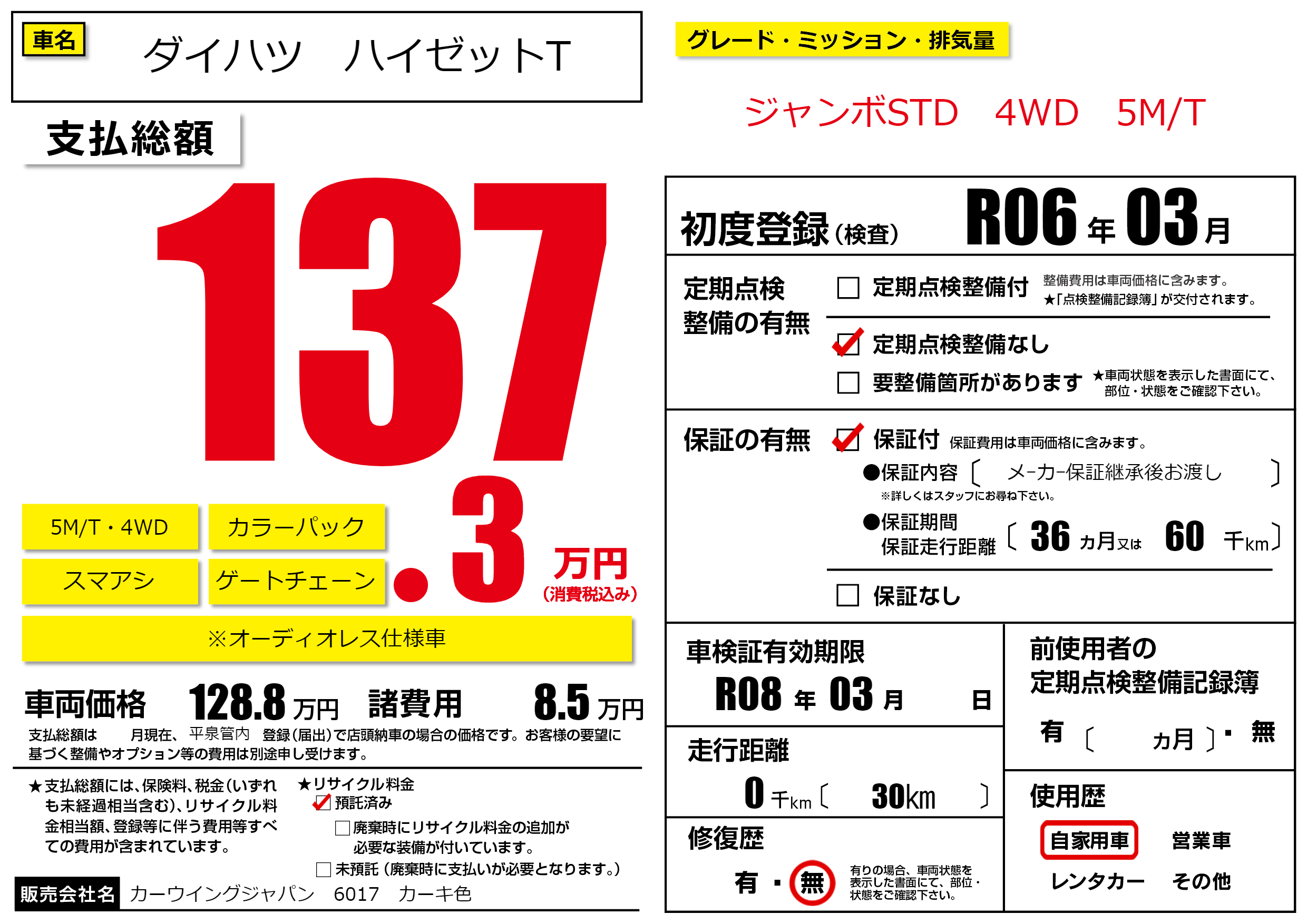 | 車名 | ダイハツ ハイゼットT | グレード ミッション 排気量 |