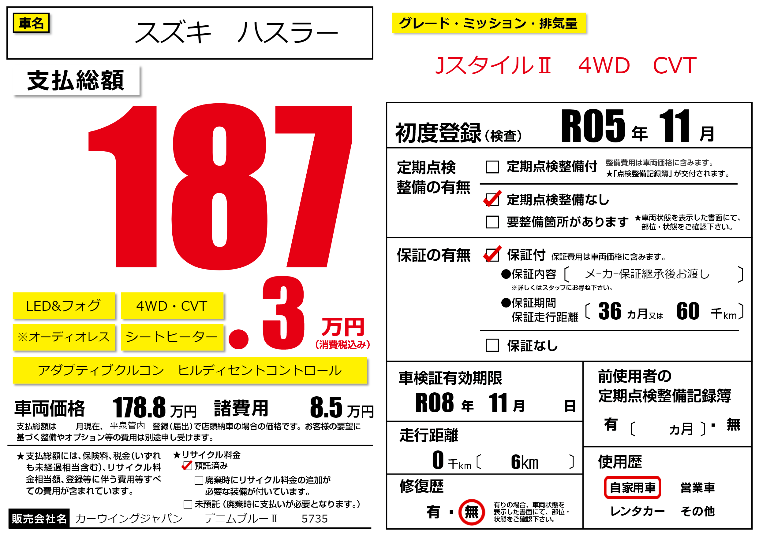 | 車名 | スズキ ハスラー | グレード ミッション 排気量 |