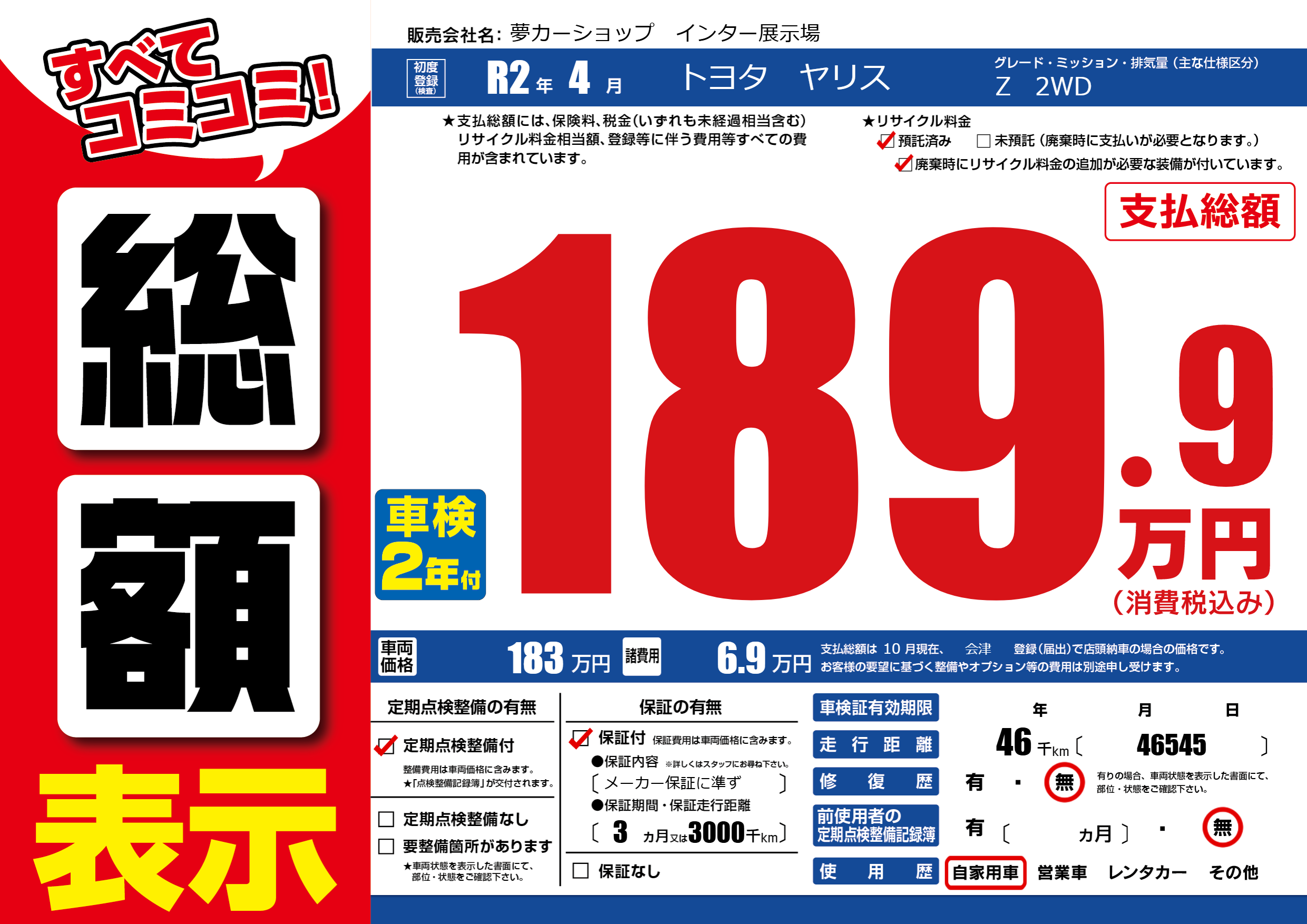 | 車名 | トヨタ ヤリス | グレード ミッション 排気量 |