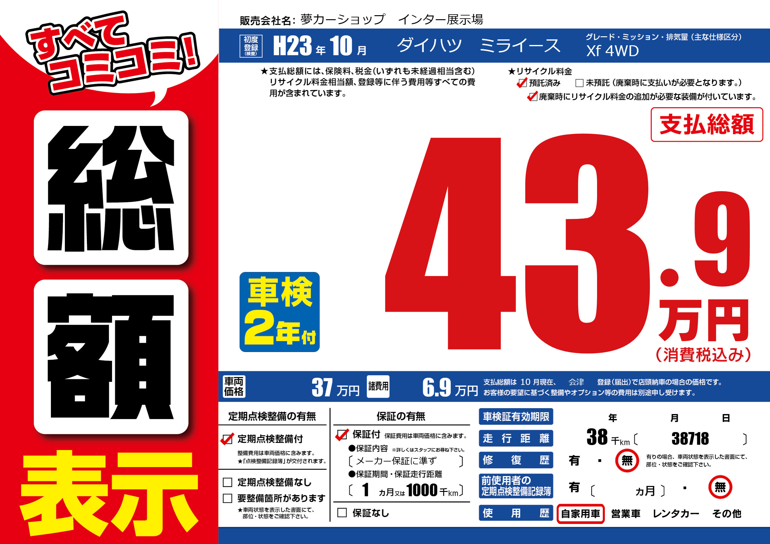 | 走行キロ | 3.8万km | 初年度登録 | H23年10月 |
