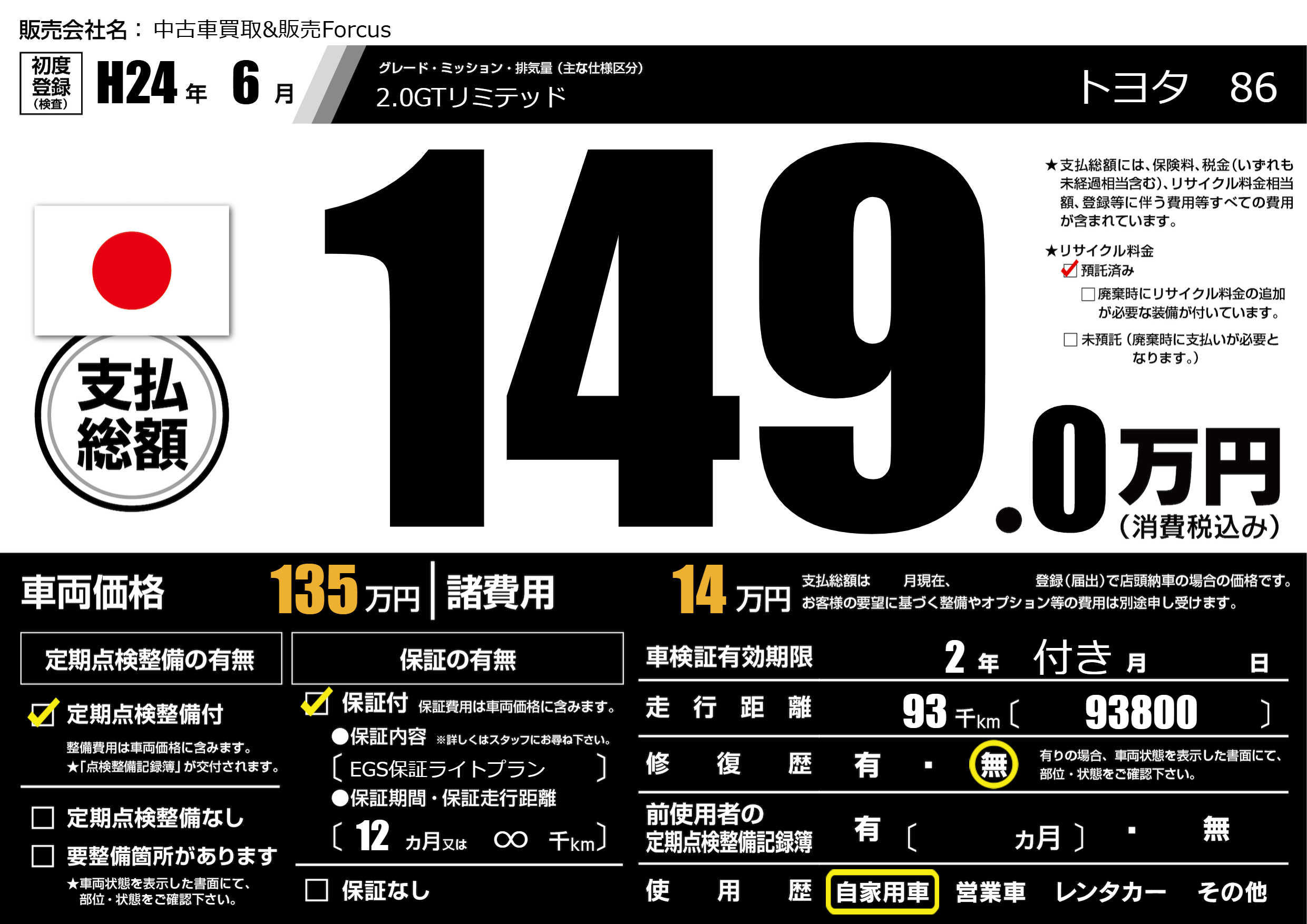 | 車名 | トヨタ 86 | グレード ミッション 排気量 |