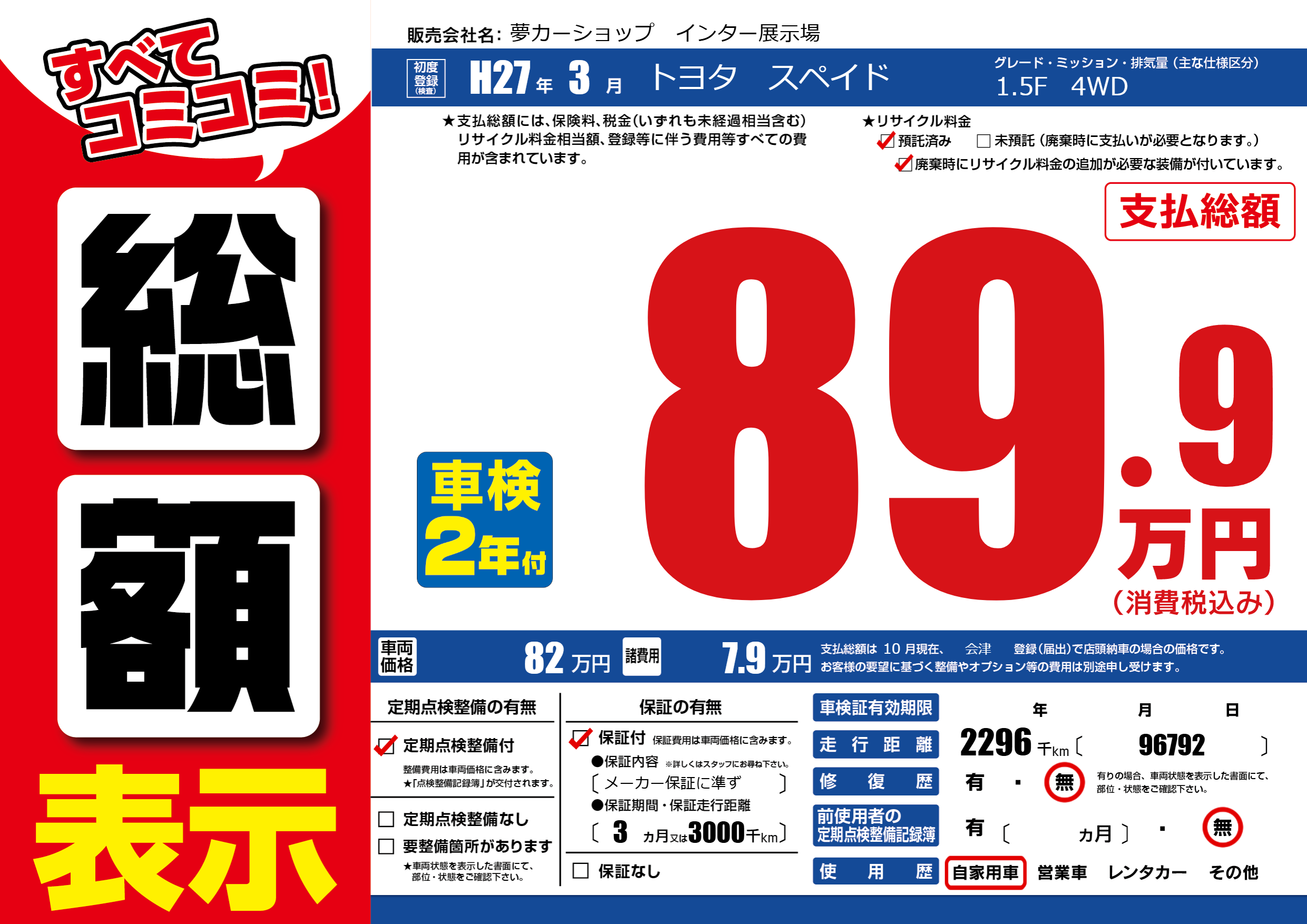 | 車名 | トヨタ スペイド | グレード ミッション 排気量 |