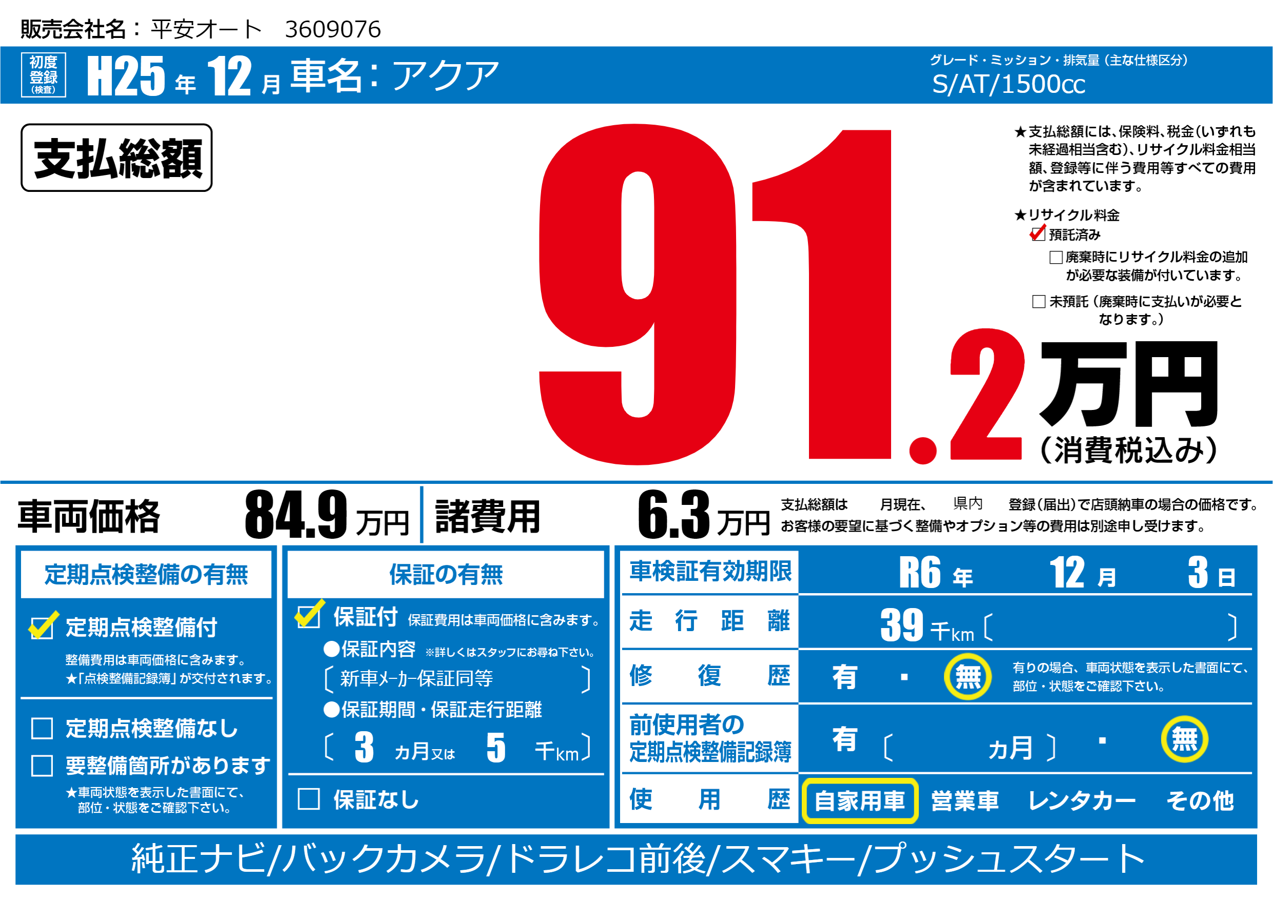 | 走行キロ | 3.9万km | 初年度登録 | H25年12月 |