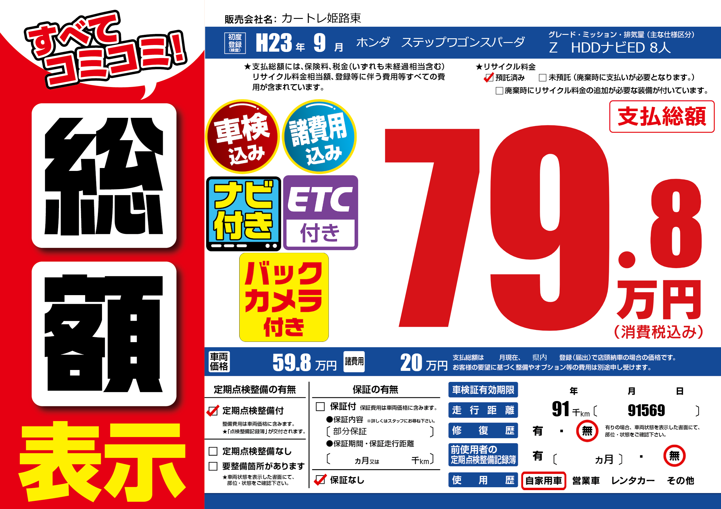 | 走行キロ | 9.1万km | 初年度登録 | H23年9月 |