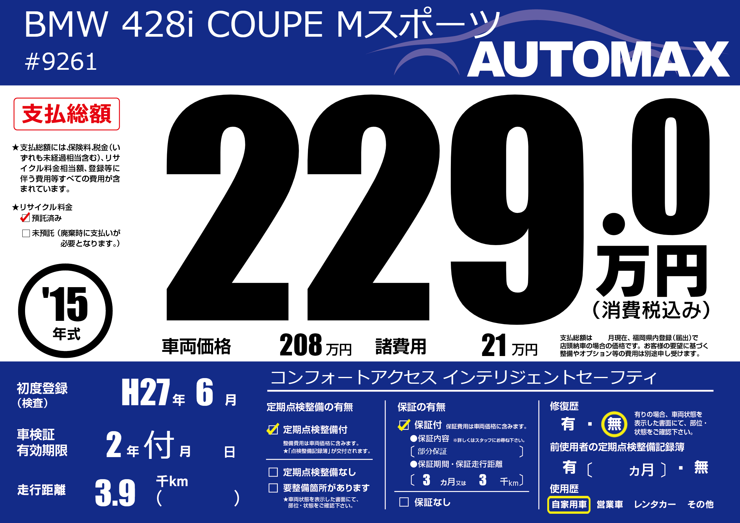 | 車名 | BMW 428i COUPE Mスポーツ | グレード ミッション 排気量 |