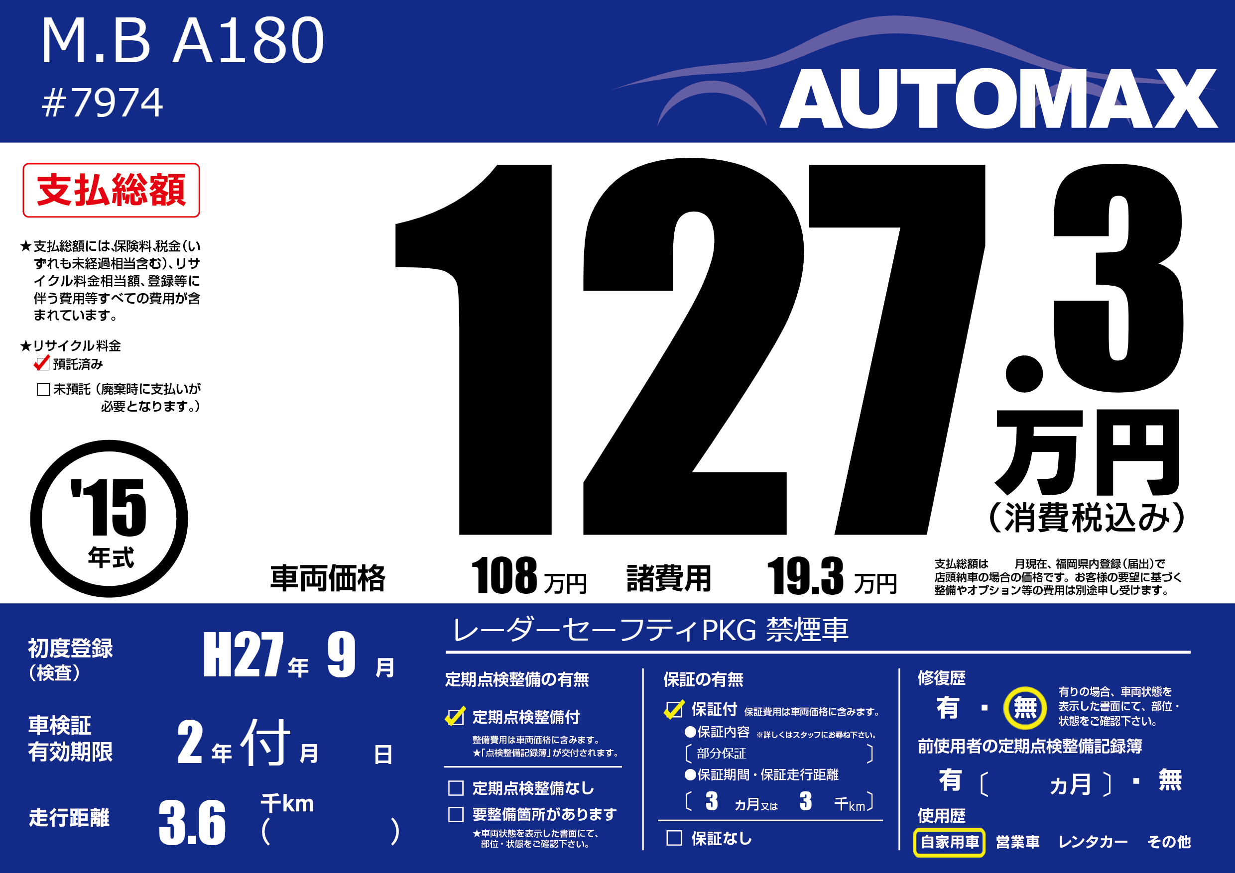 | 車名 | M.B A180 | グレード ミッション 排気量 |