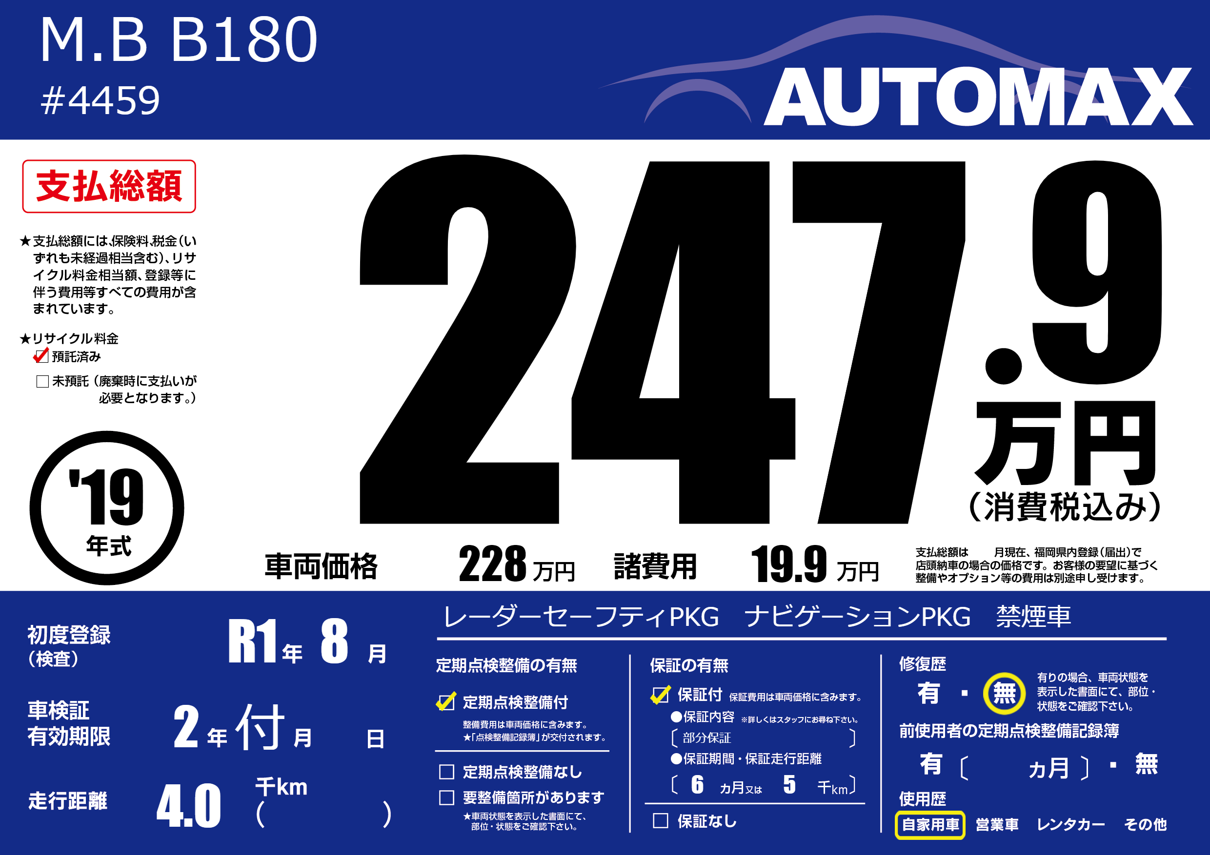 | 車名 | M.B B180 | グレード ミッション 排気量 |