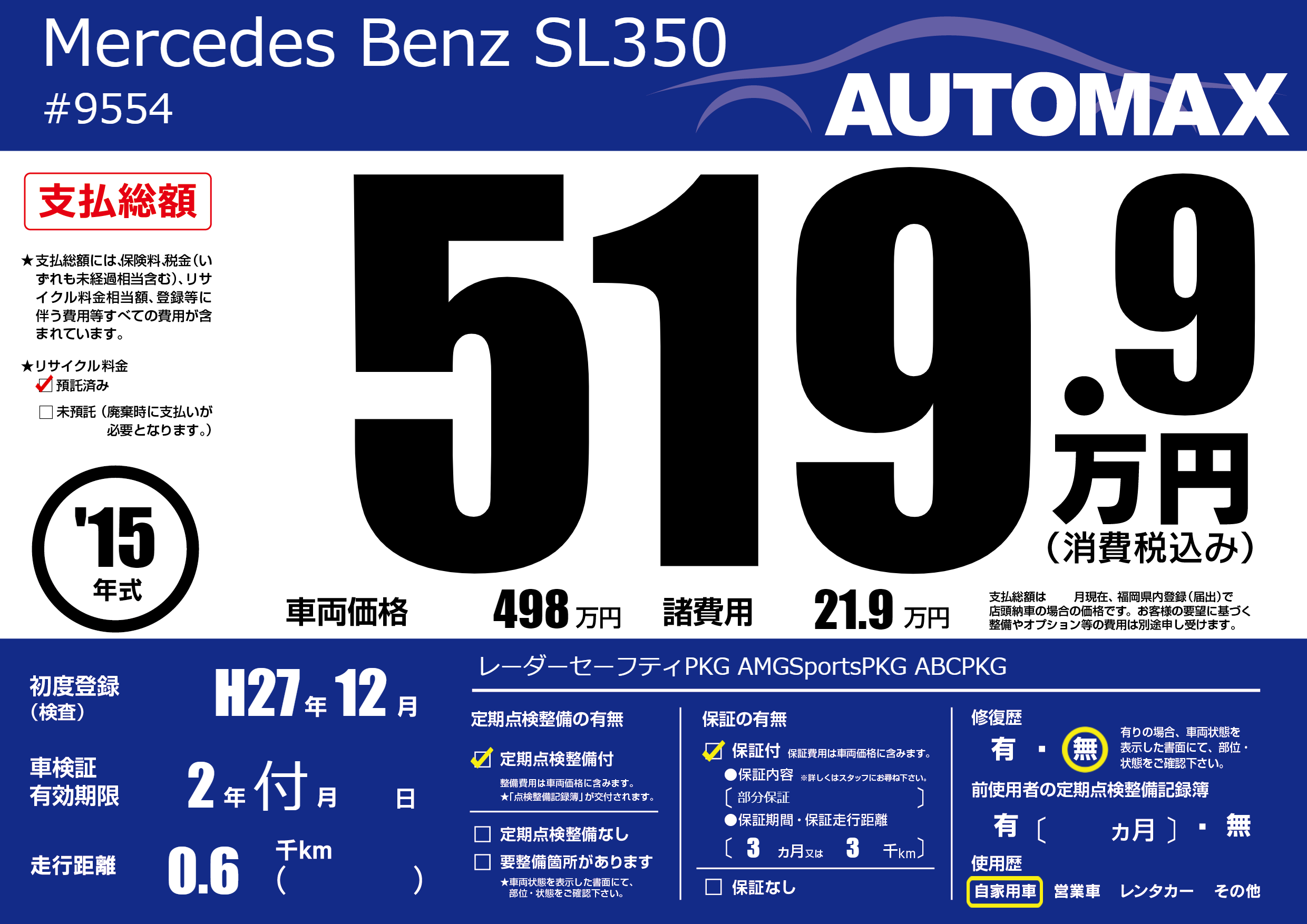 | 車名 | Mercedes Benz SL350 | グレード ミッション 排気量 |