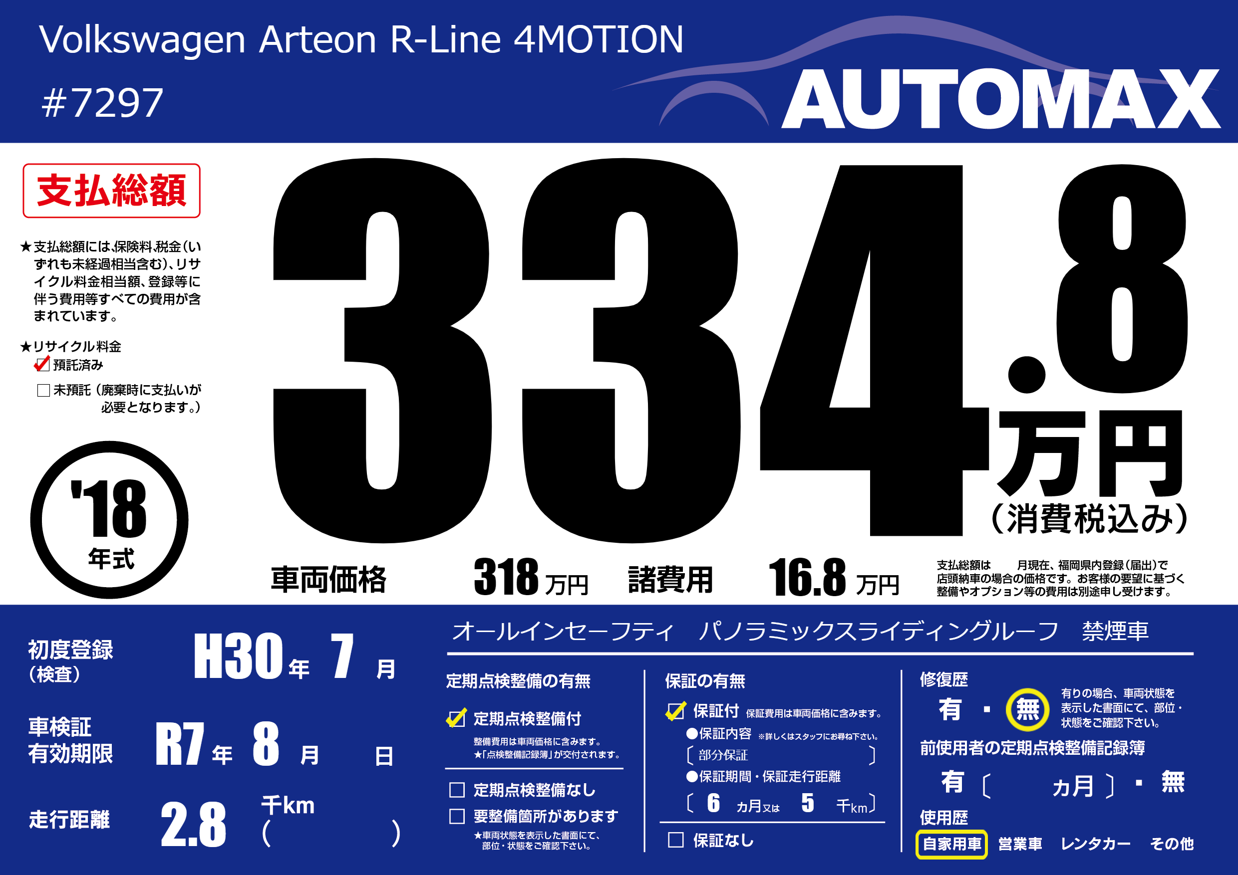| 車名 | Volkswagen Arteon R-Line 4MOTION | グレード ミッション 排気量 |