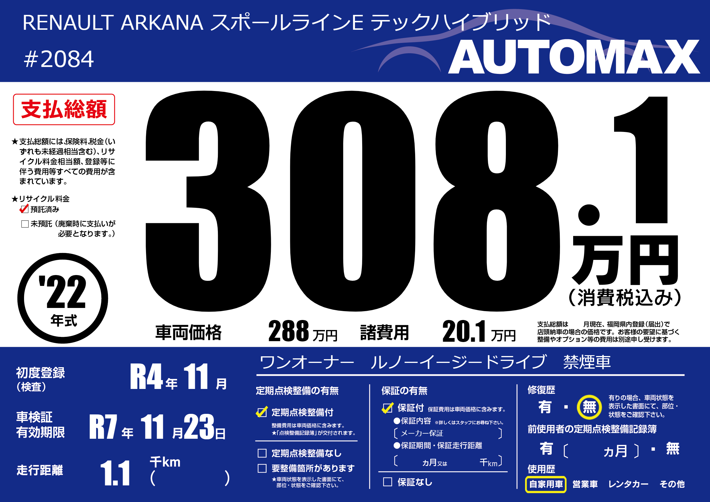 | 車名 | RENAULT ARKANA スポールラインE テックハイブリッド | グレード ミッション 排気量 |