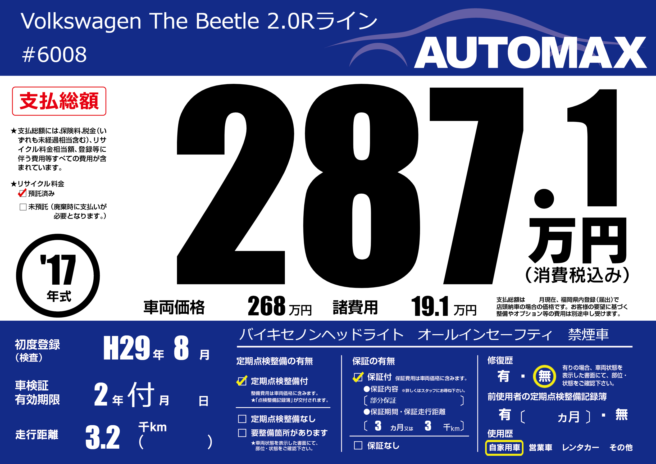 | 車名 | Volkswagen The Beetle 2.0Rライン | グレード ミッション 排気量 |
