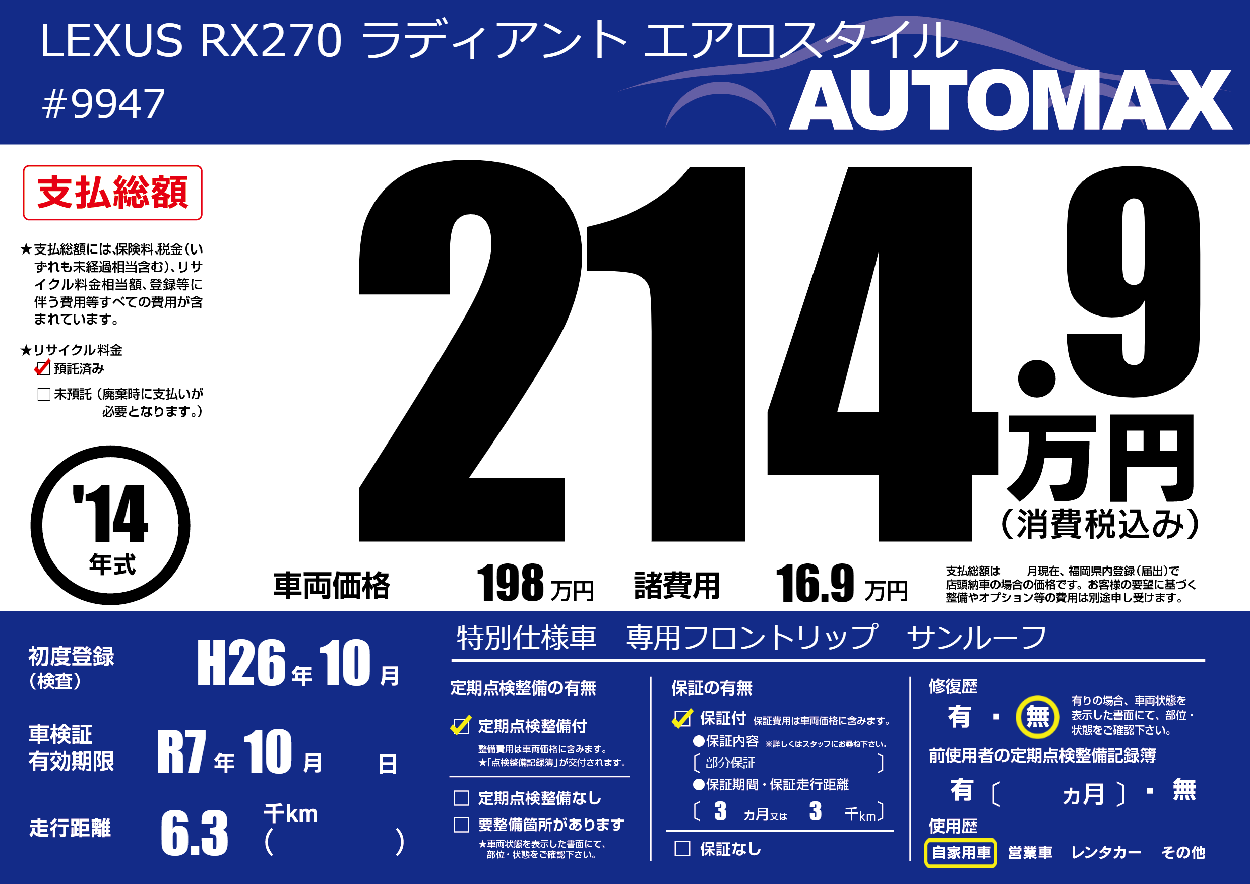 | 車名 | LEXUS RX270 ラディアント エアロスタイル | グレード ミッション 排気量 |