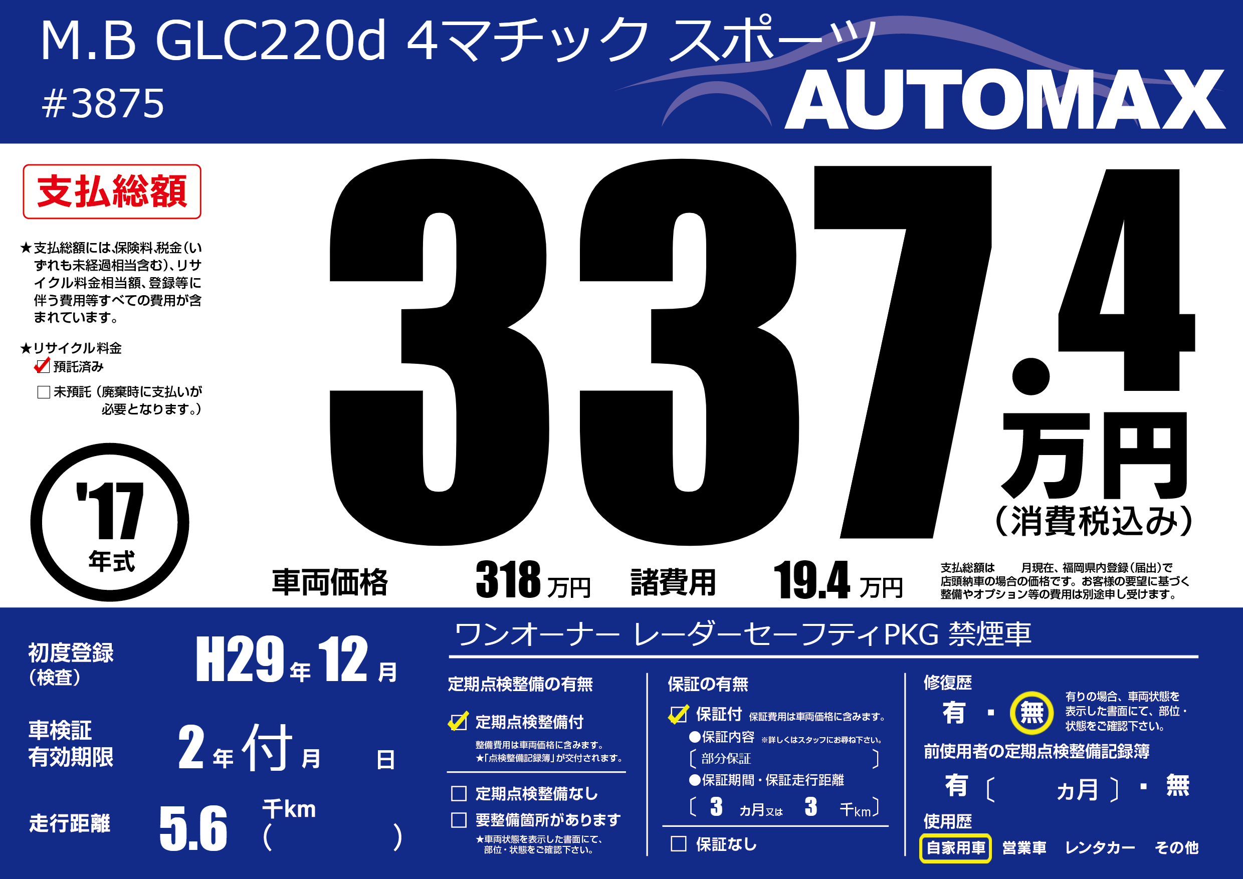 | 車名 | M.B GLC220d 4マチック スポーツ | グレード ミッション 排気量 |