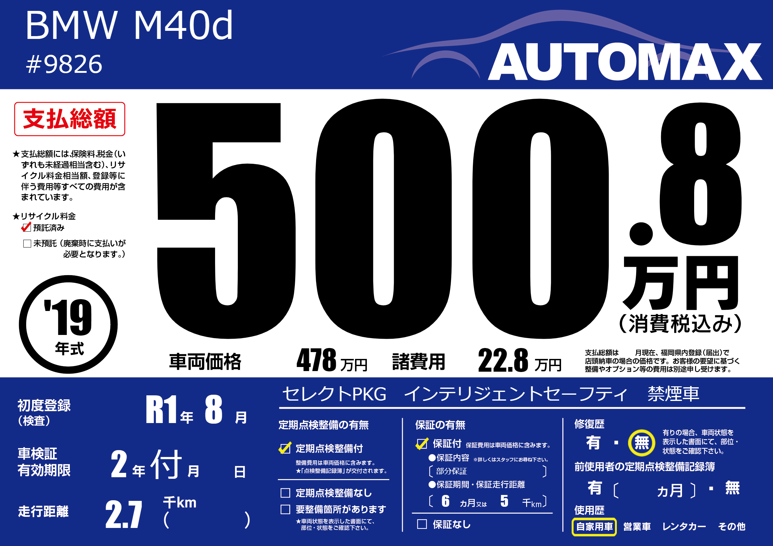 | 車名 | BMW M40d | グレード ミッション 排気量 |