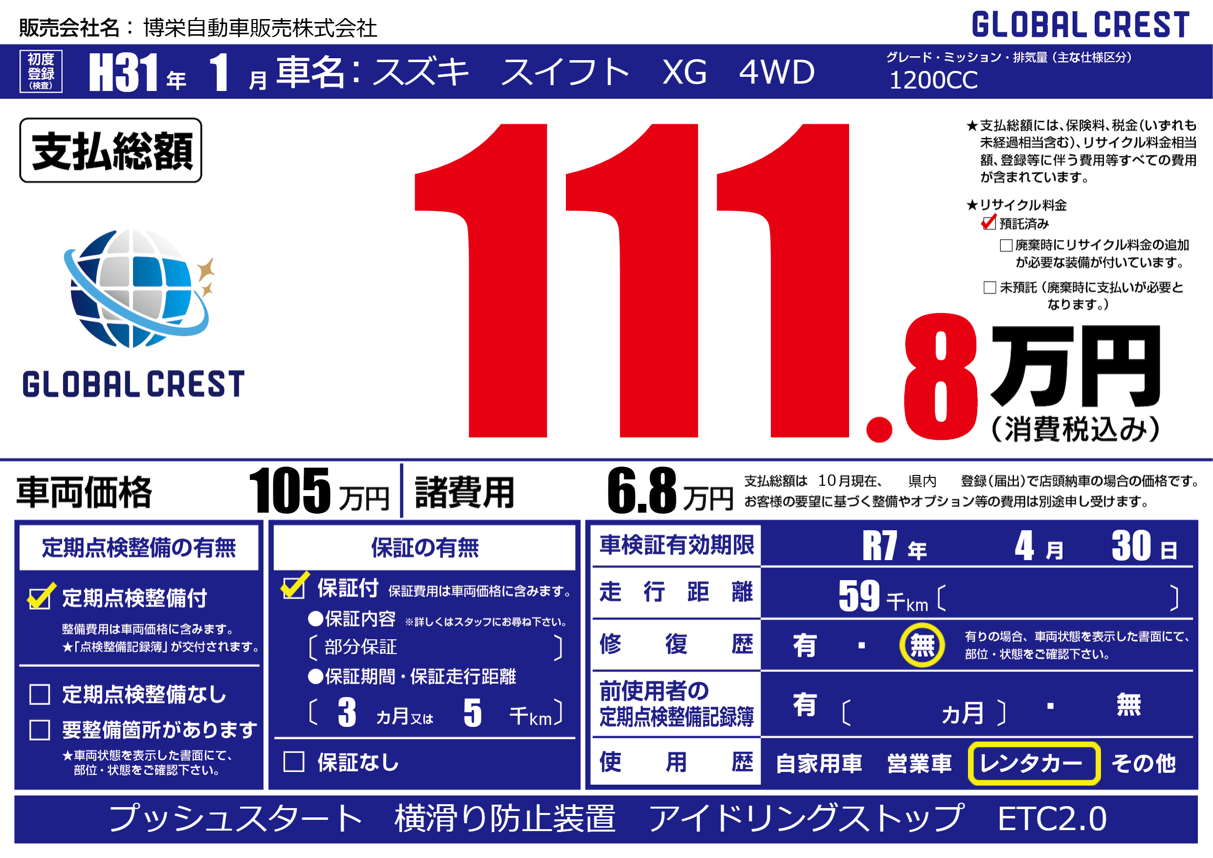 | 車名 | スズキ スイフト XG 4WD | グレード ミッション 排気量 |