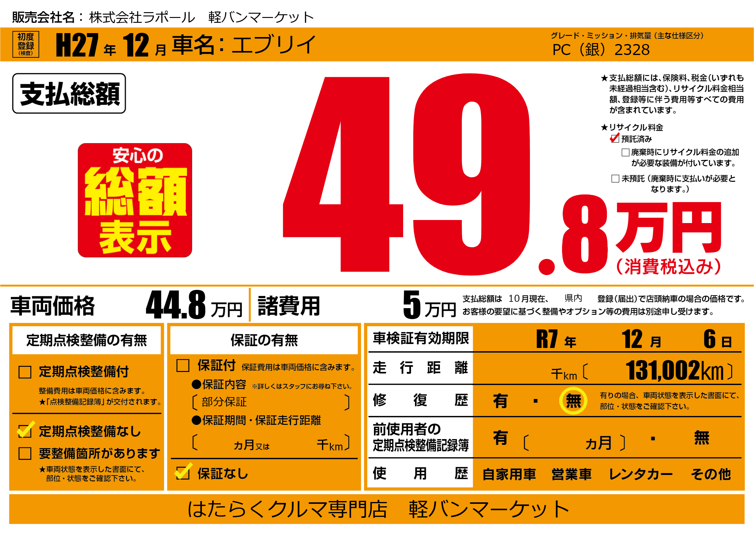 | 車名 | エブリイ | グレード ミッション 排気量 |