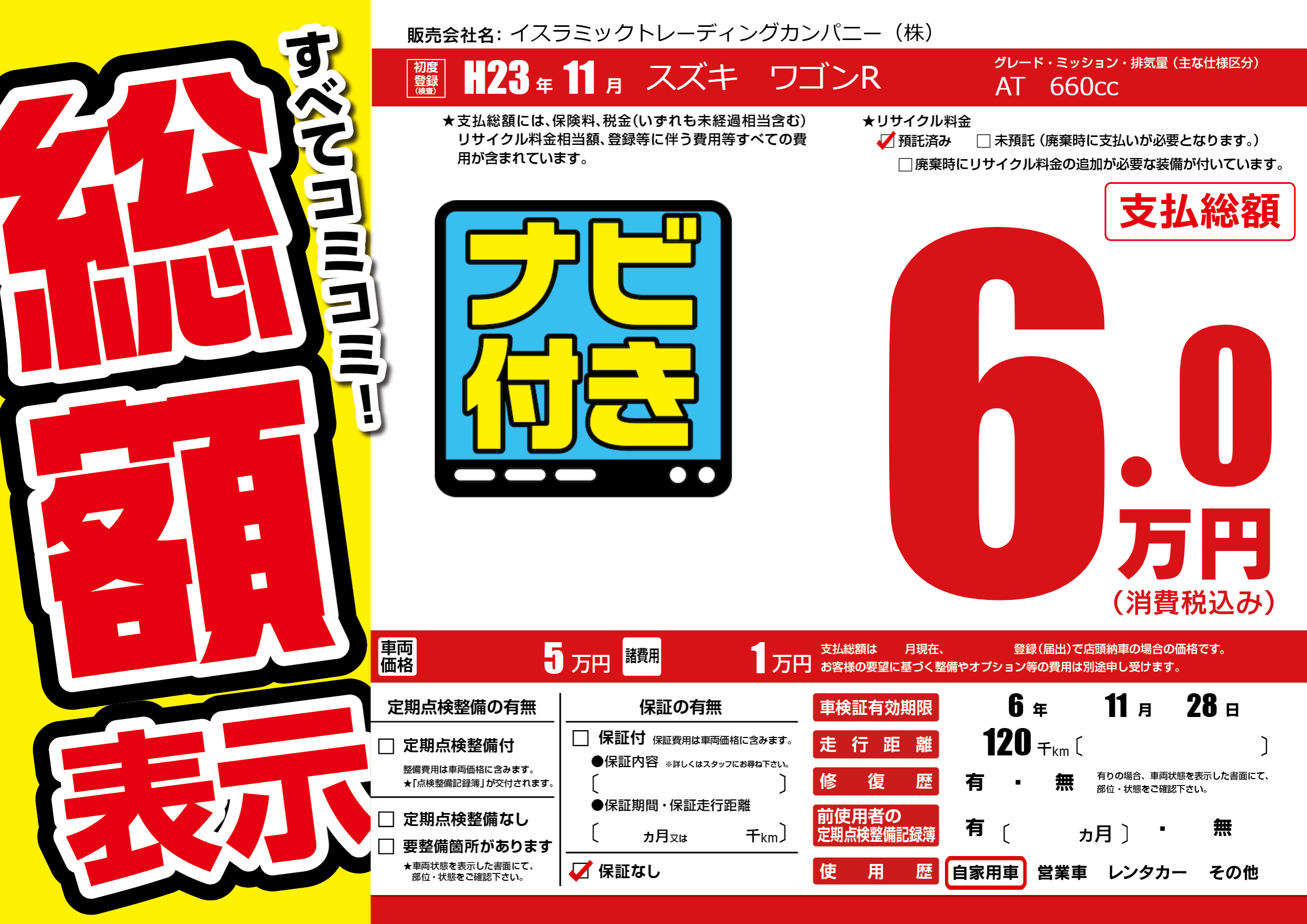 | 走行キロ | 12万km | 初年度登録 | H23年11月 |