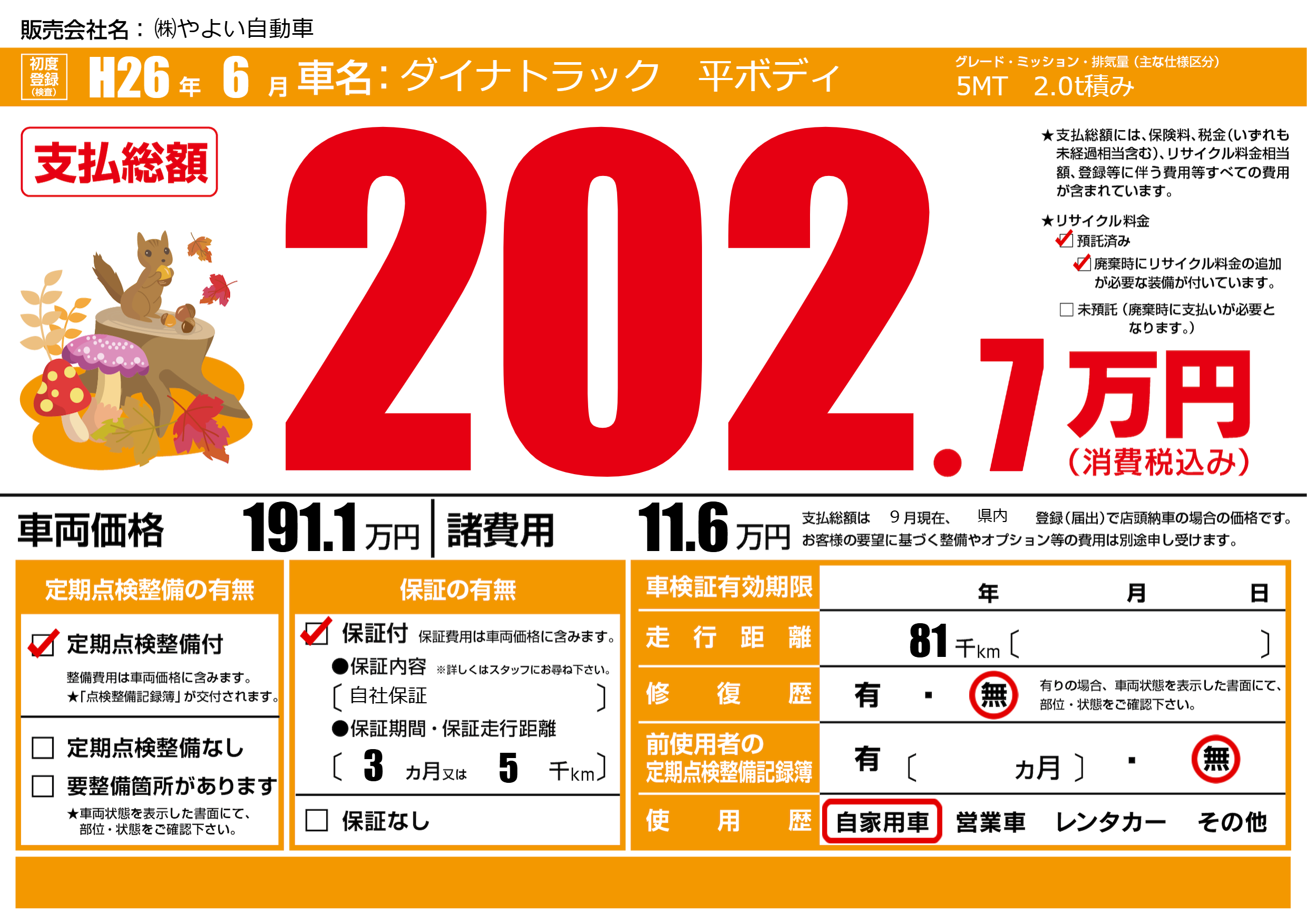 | 車名 | ダイナトラック 平ボディ | グレード ミッション 排気量 |