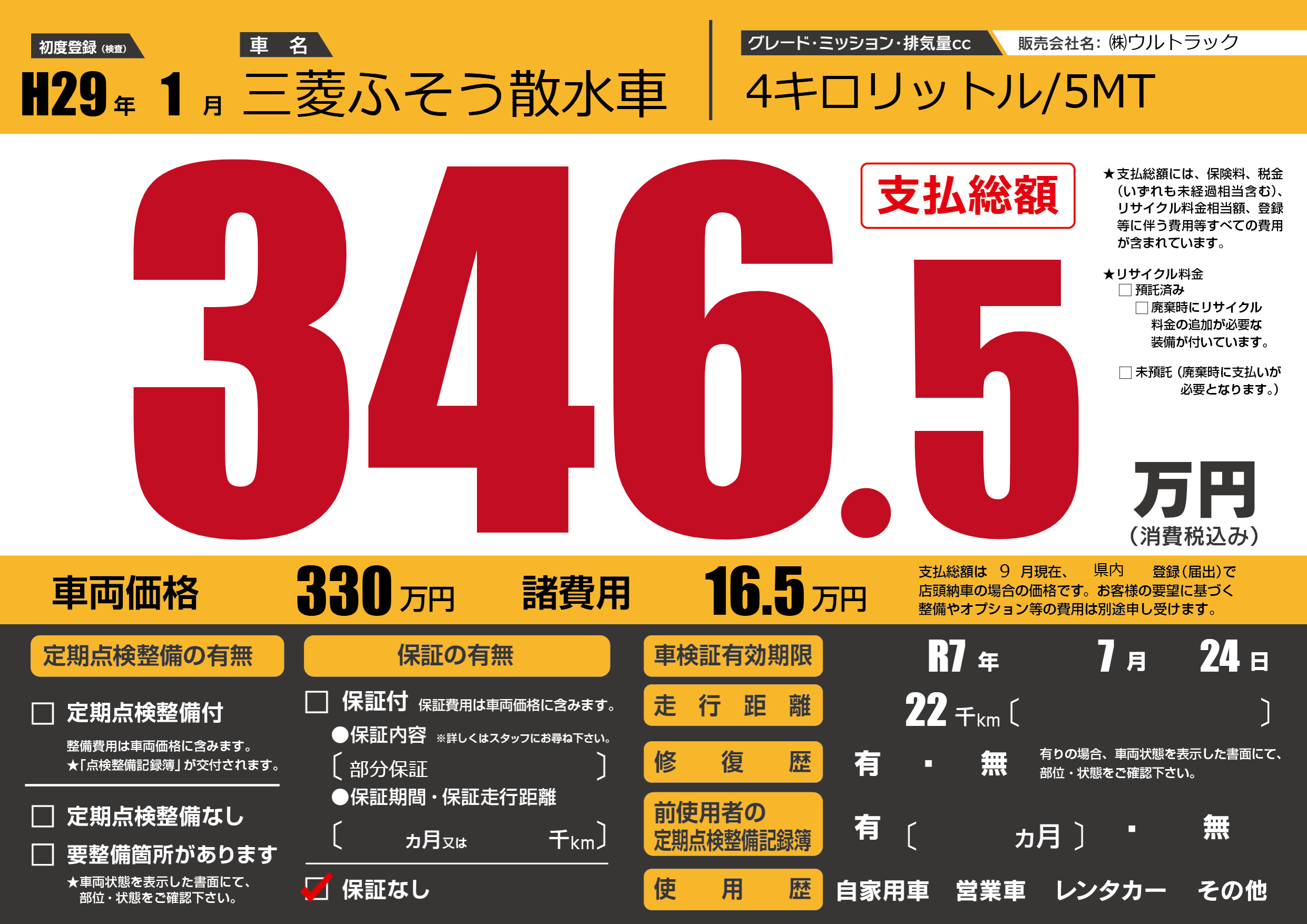 | 車名 | 三菱ふそう散水車 | グレード ミッション 排気量 |