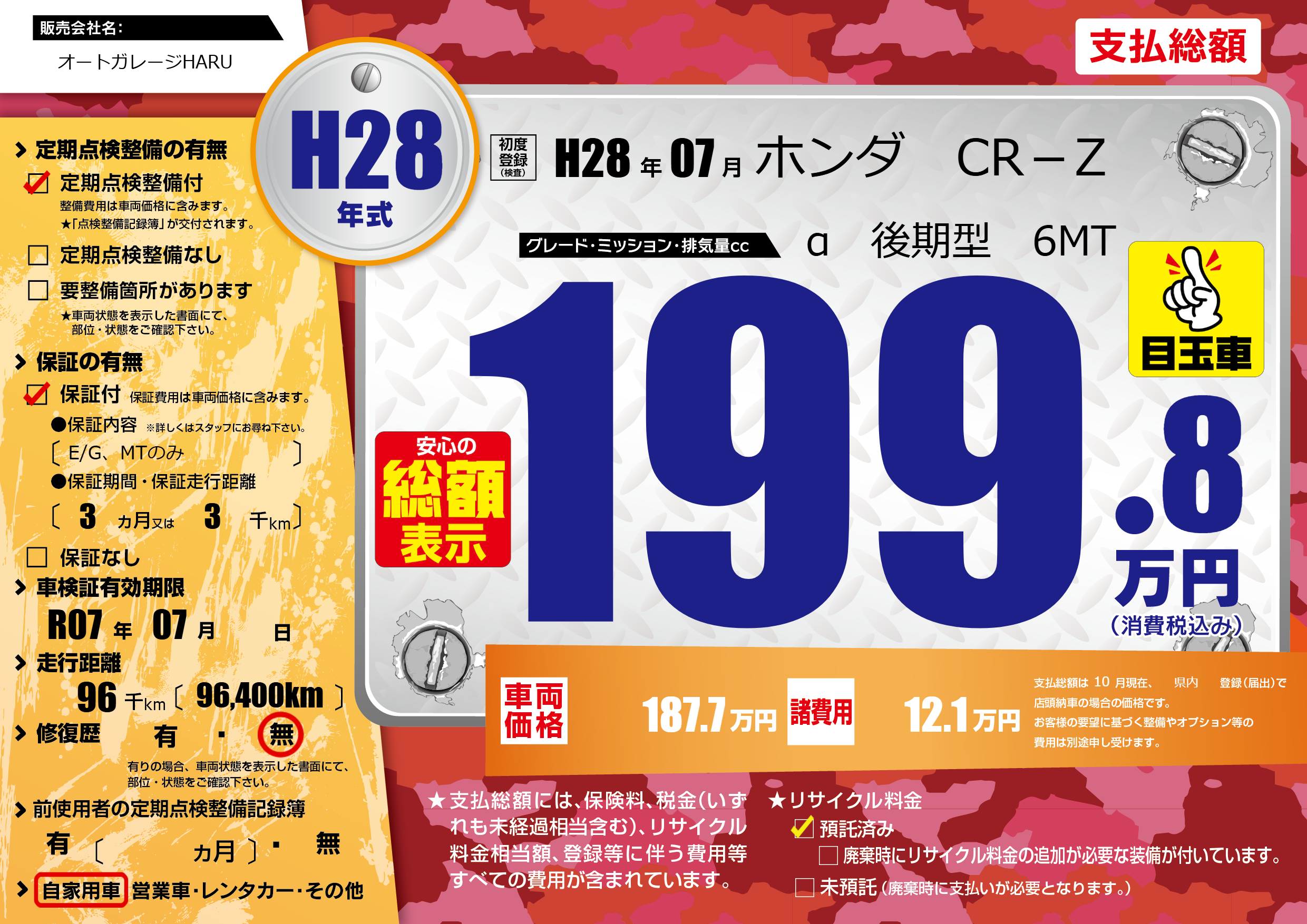 | 車名 | ホンダ CR-Z | グレード ミッション 排気量 |