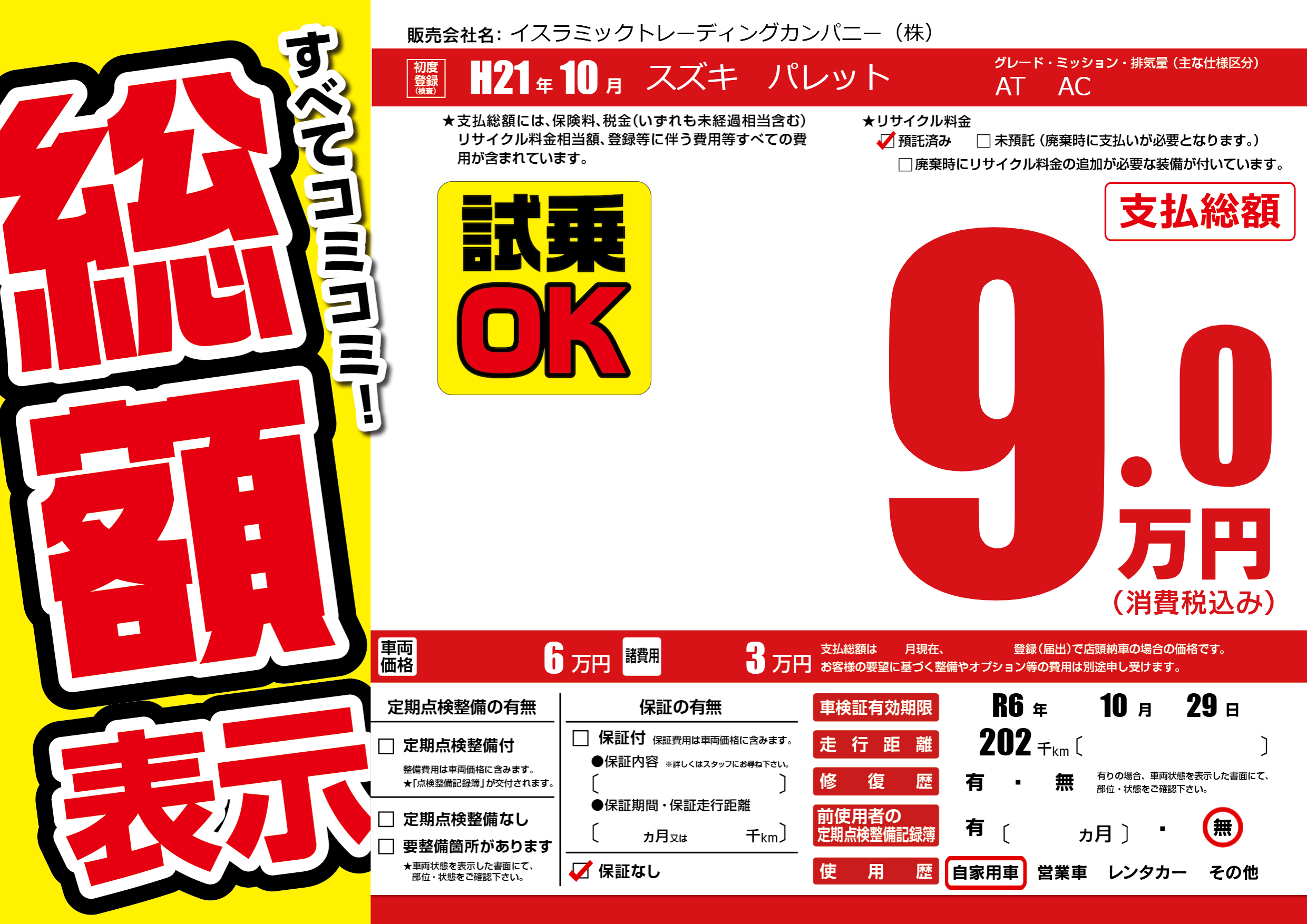| 車名 | スズキ パレット | グレード ミッション 排気量 |