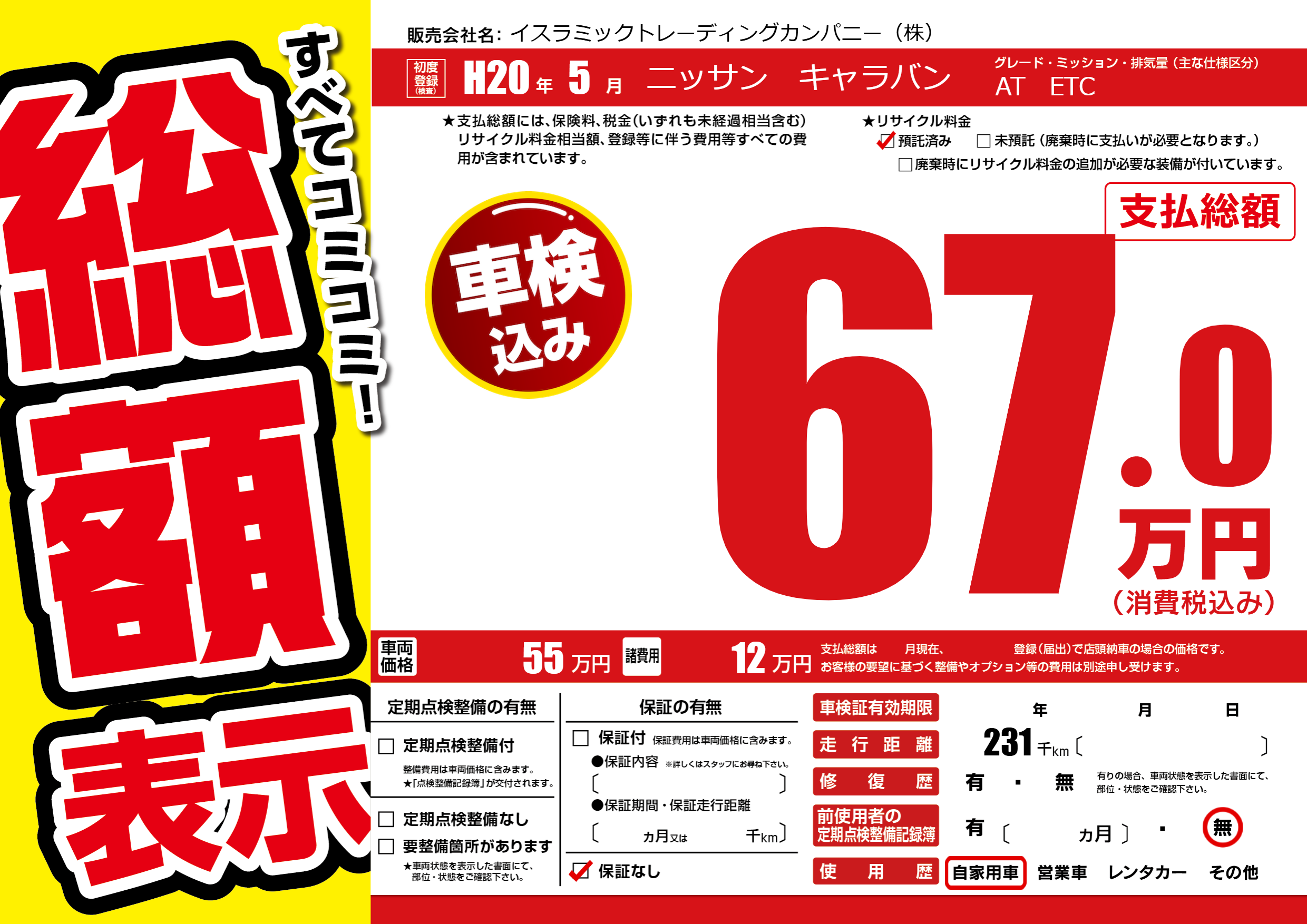 | 走行キロ | 23.1万km | 初年度登録 | H20年5月 |