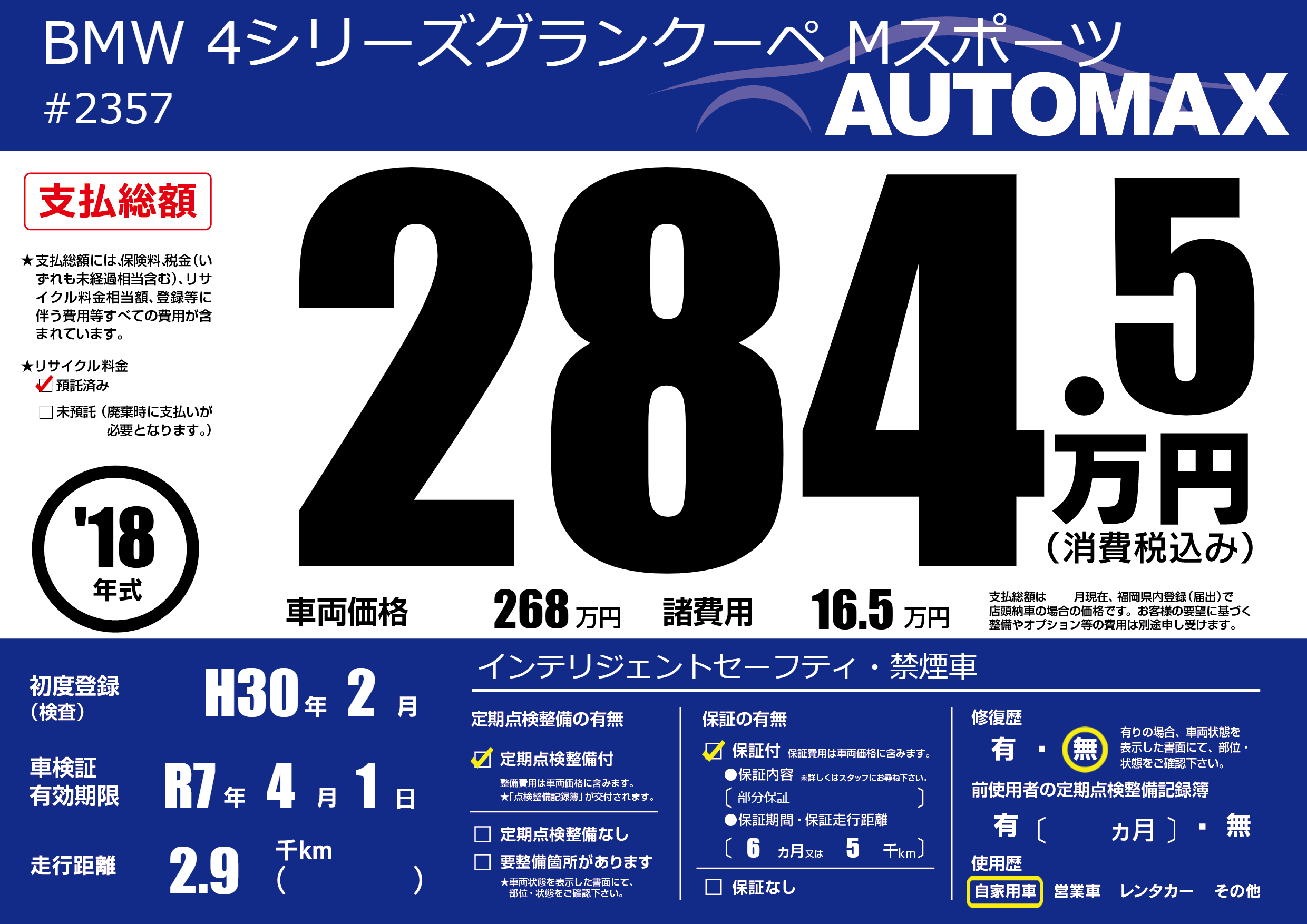 | 車名 | BMW 4シリーズグランクーペ Mスポーツ | グレード ミッション 排気量 |