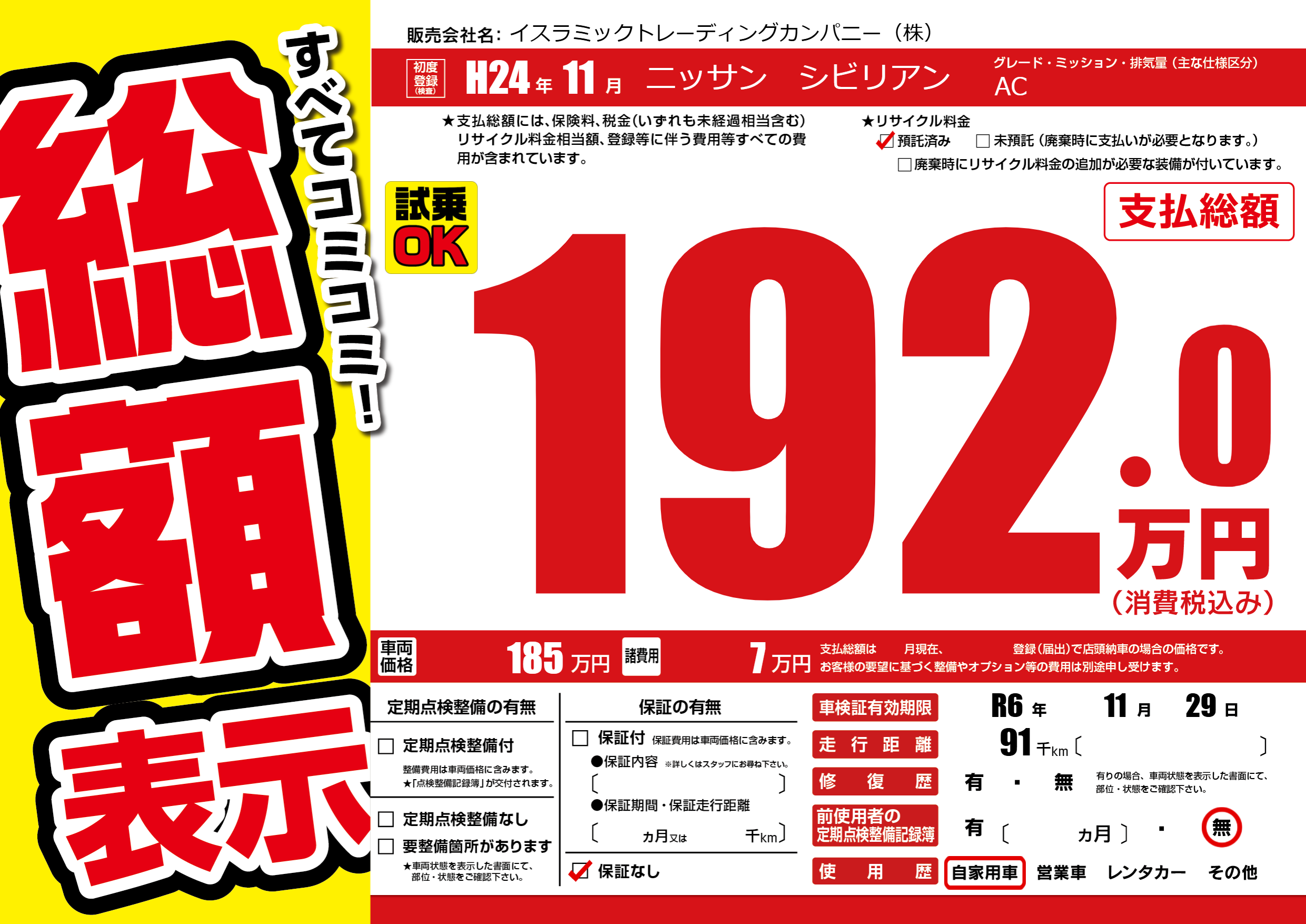 | 車名 | ニッサン シビリアン | グレード ミッション 排気量 |