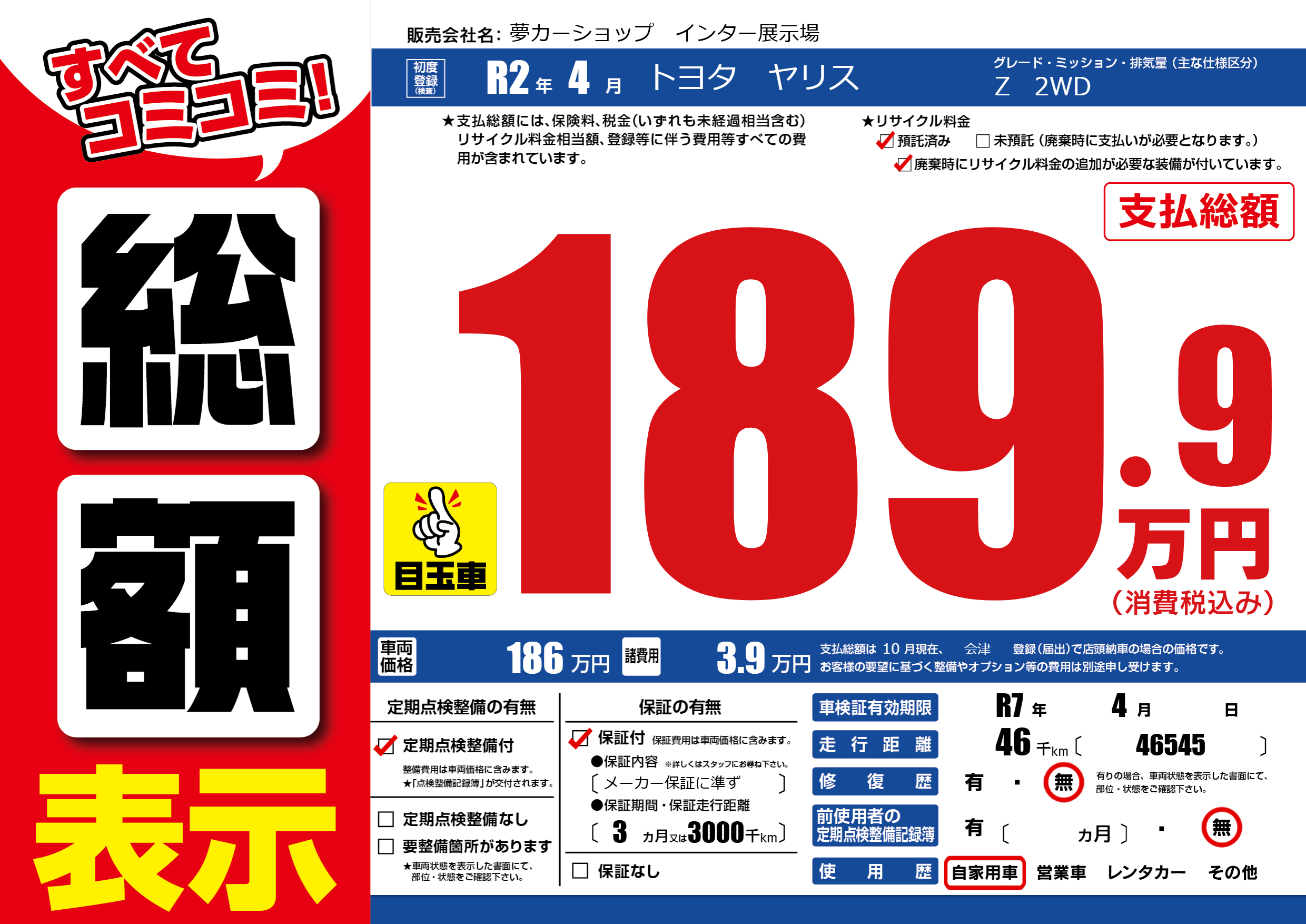 | 車名 | トヨタ ヤリス | グレード ミッション 排気量 |