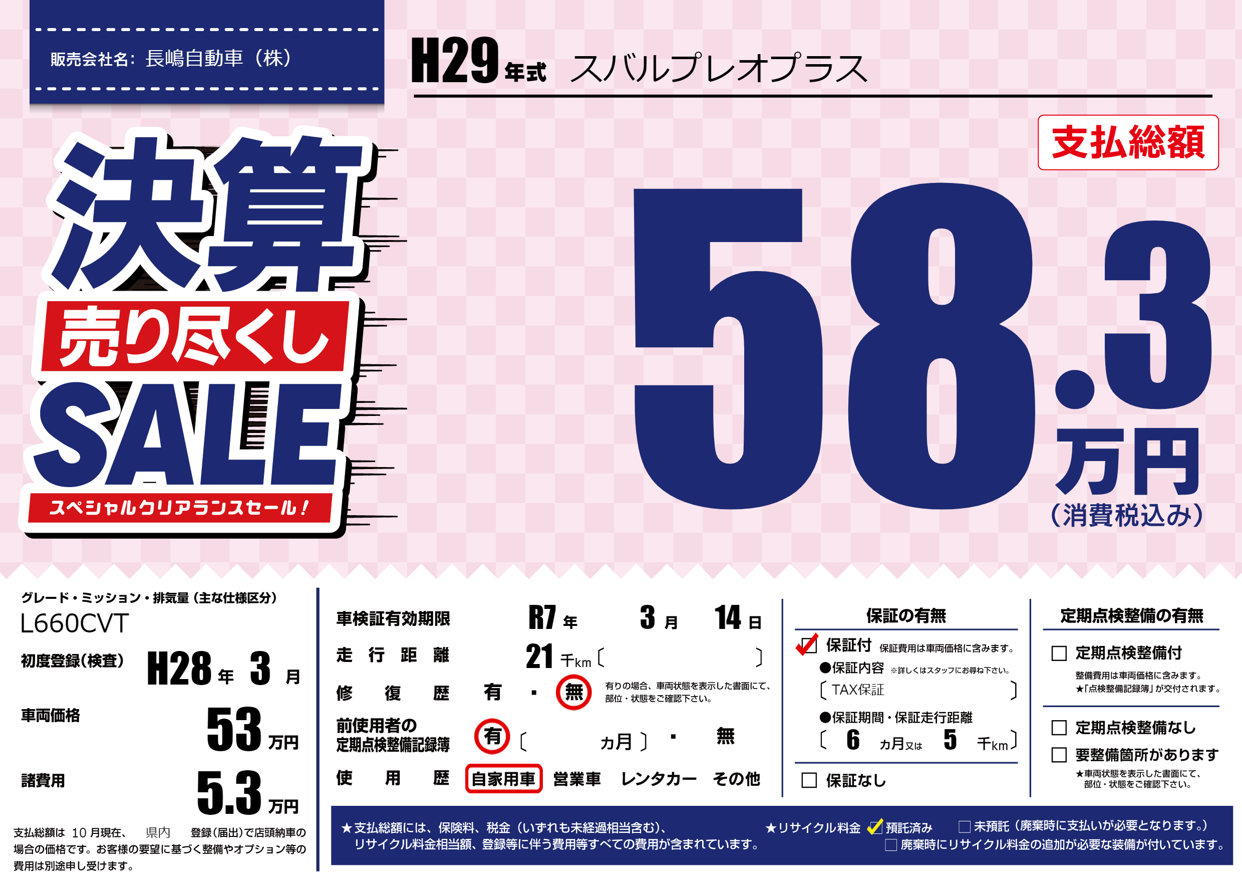 | 車名 | スバルプレオプラス | グレード ミッション 排気量 |