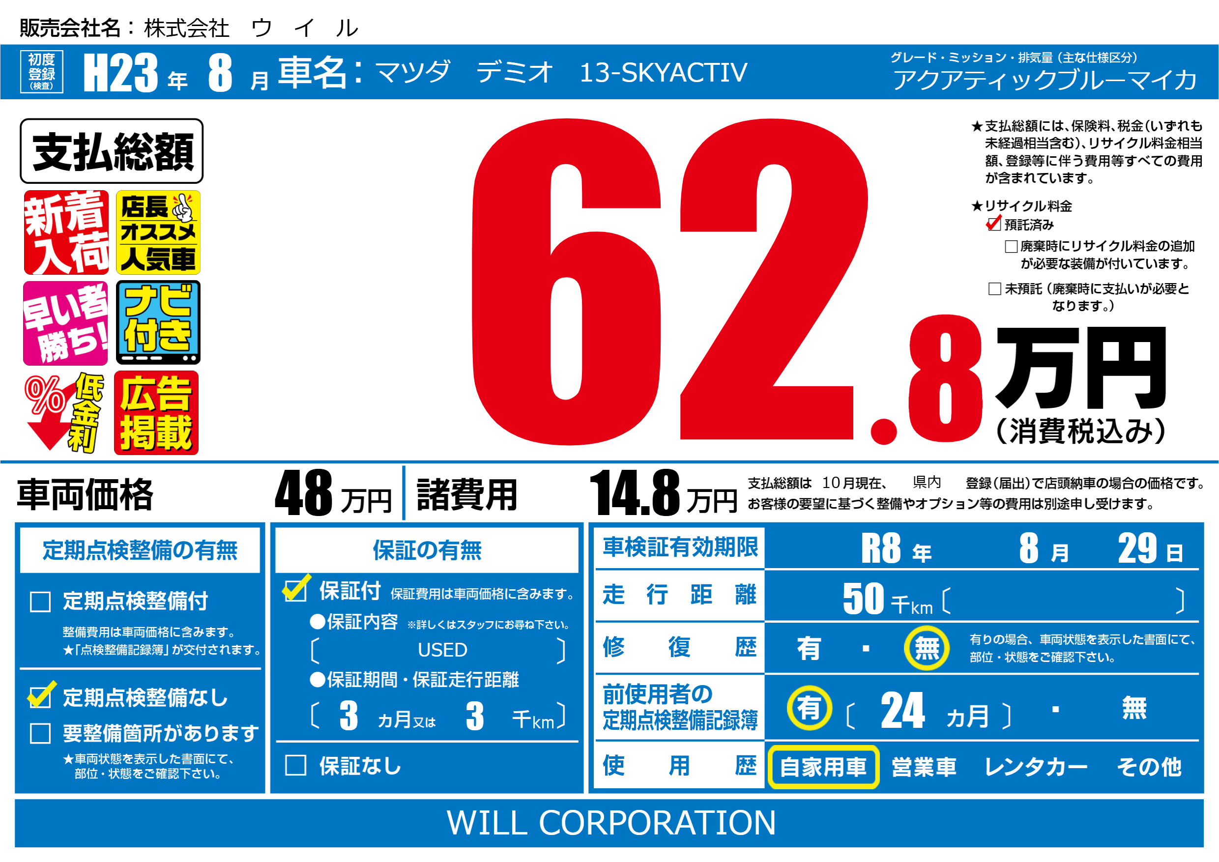 | 走行キロ | 5万km | 初年度登録 | H23年8月 |