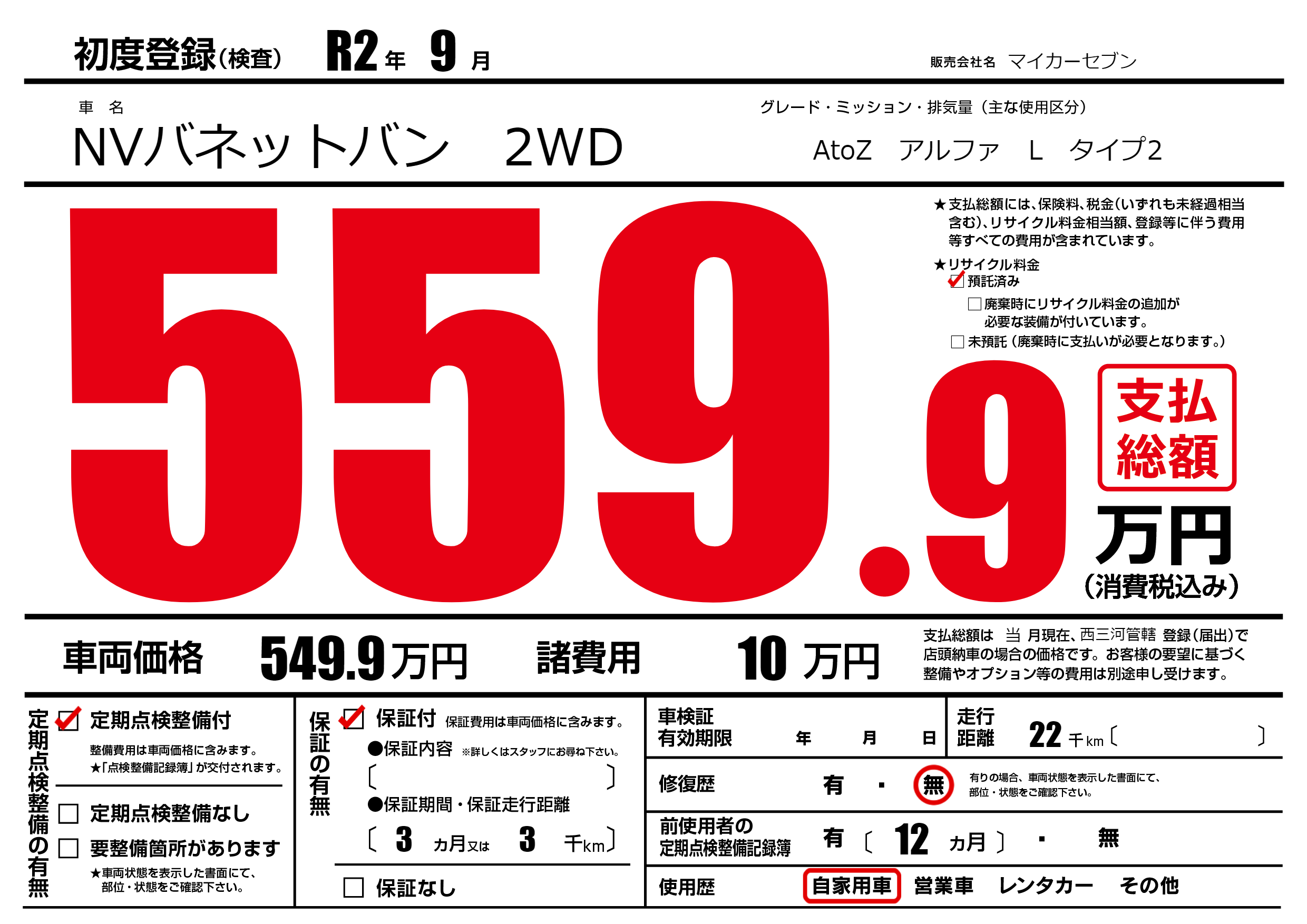 | 車名 | NVバネットバン 2WD | グレード ミッション 排気量 |