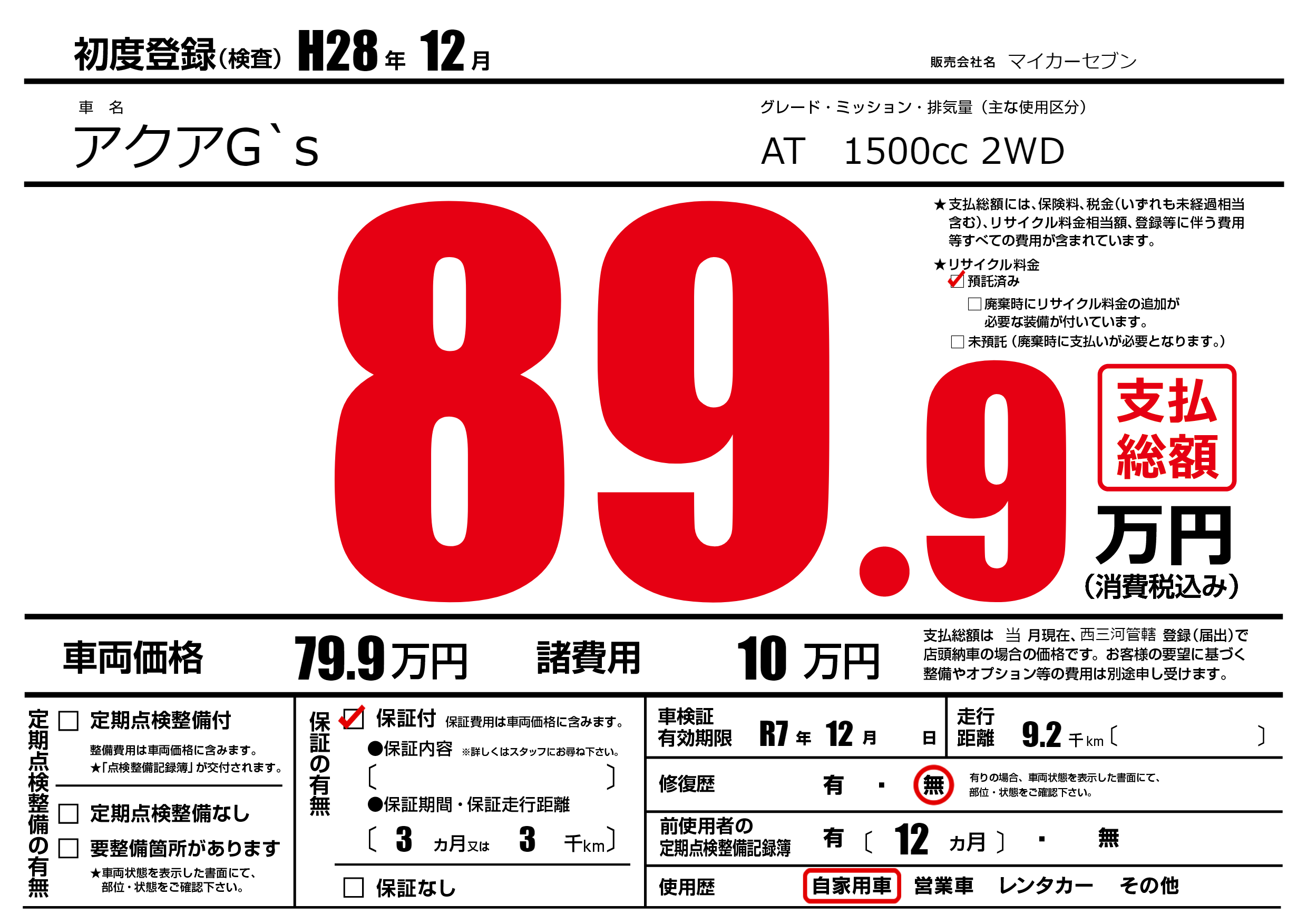 | 車名 | アクアG`s | グレード ミッション 排気量 |