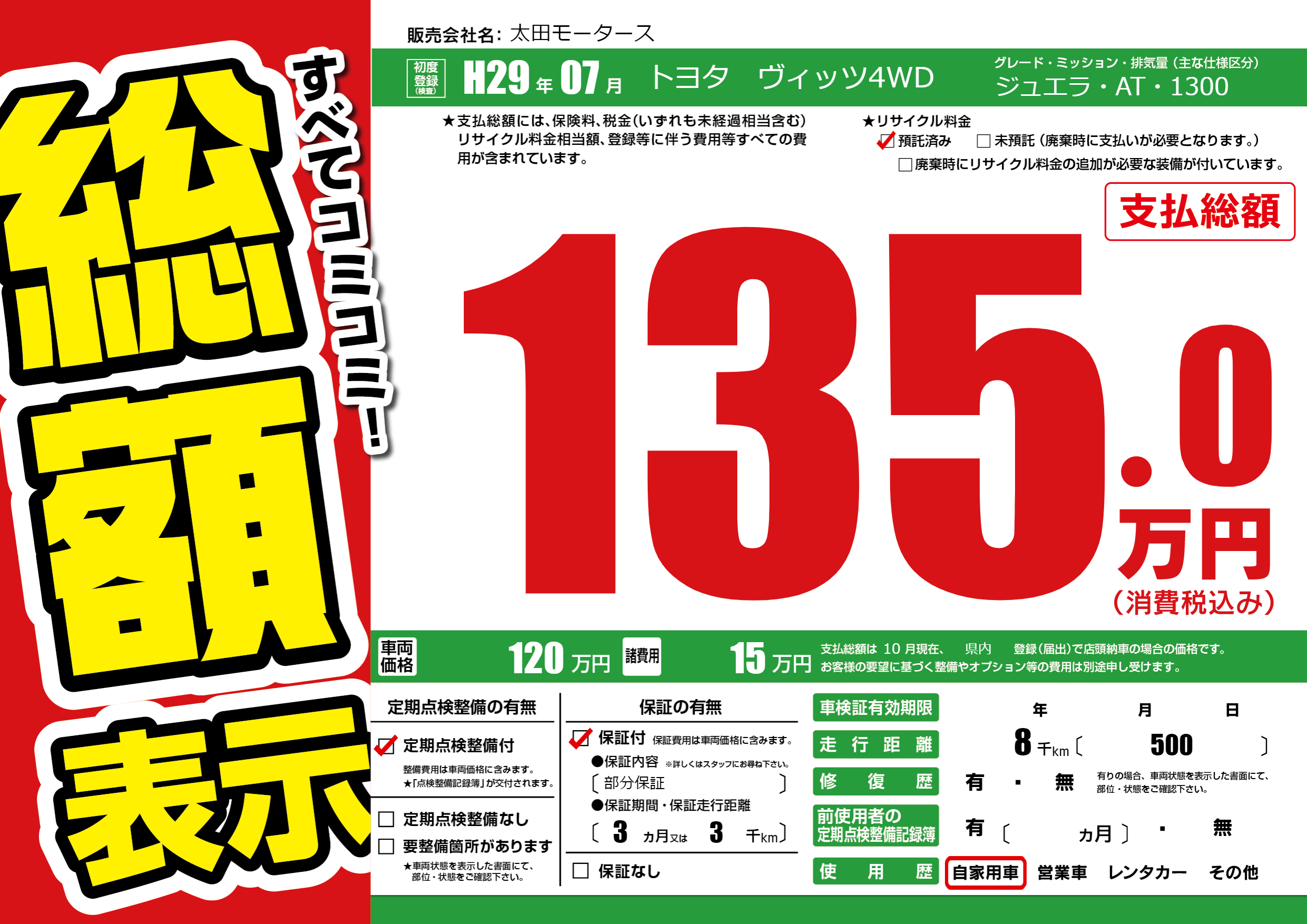 | 車名 | トヨタ ヴィッツ4WD | グレード ミッション 排気量 |
