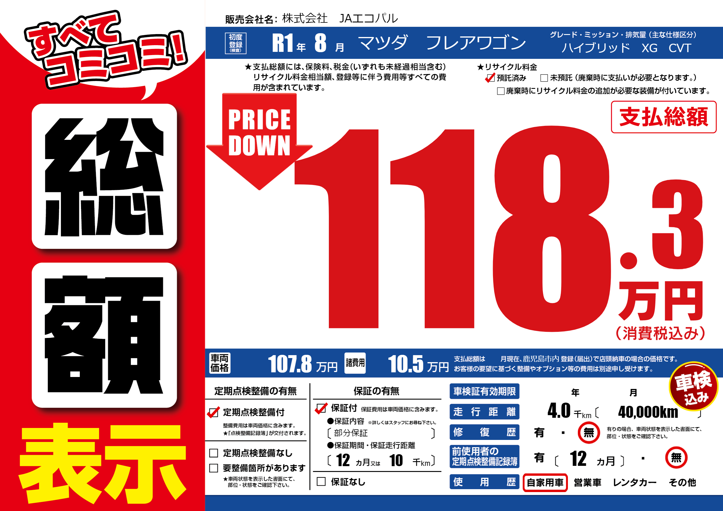 | 車名 | マツダ フレアワゴン | グレード ミッション 排気量 |