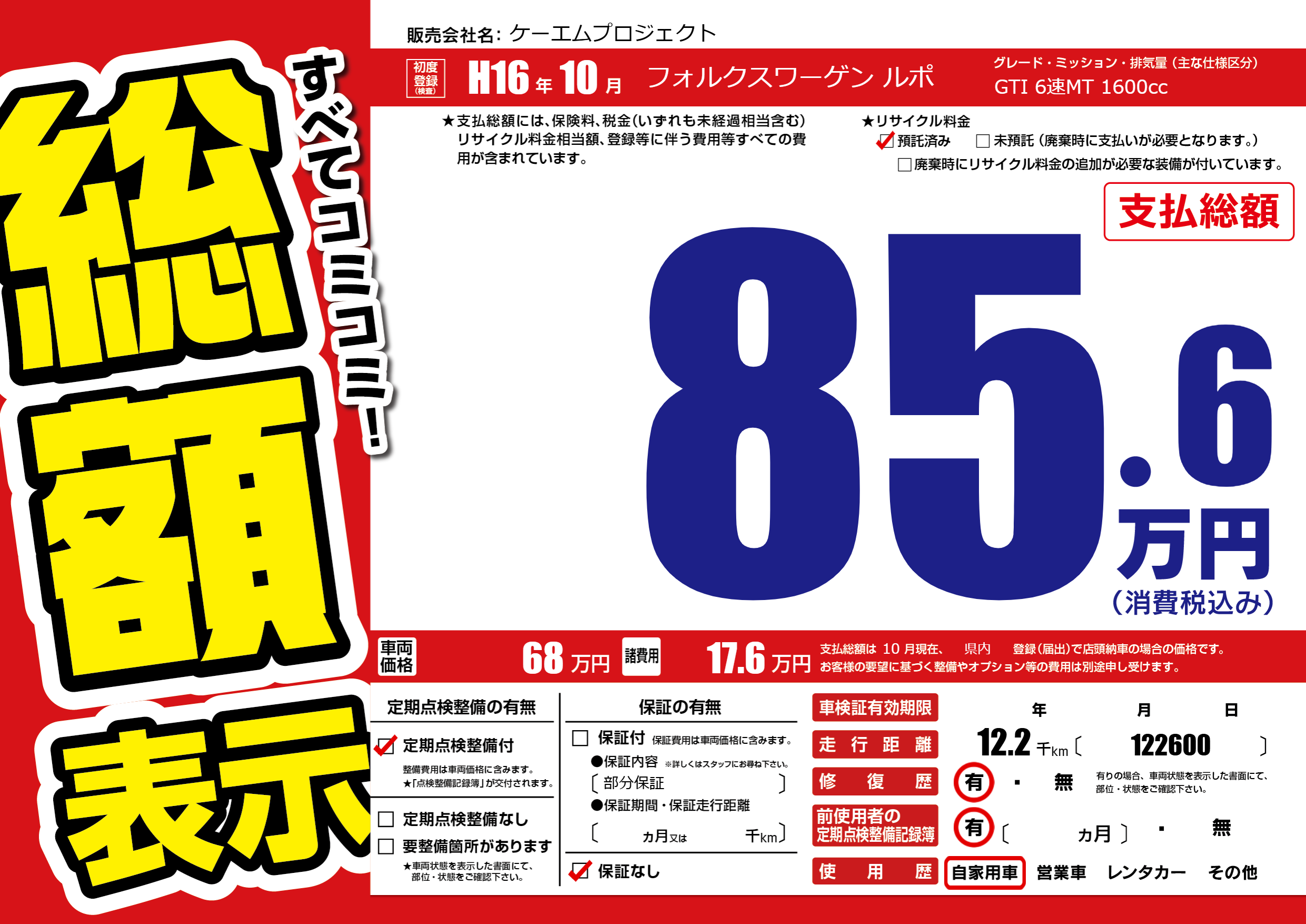 | 車名 | フォルクスワーゲン ルポ | グレード ミッション 排気量 |