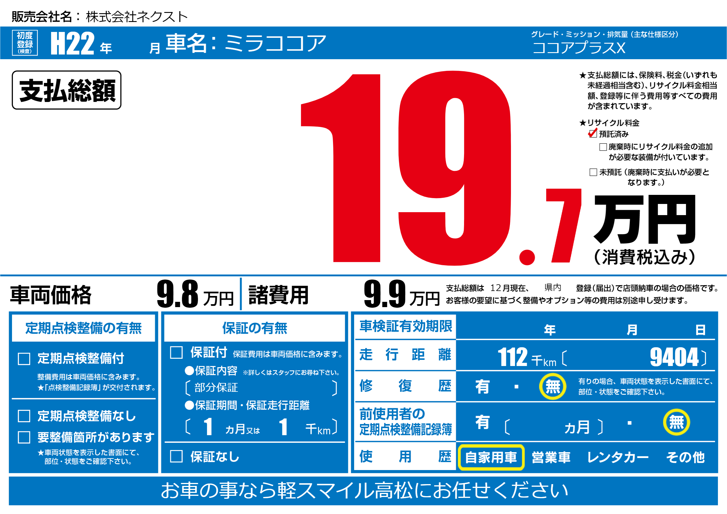 | 車名 | ミラココア | グレード ミッション 排気量 |