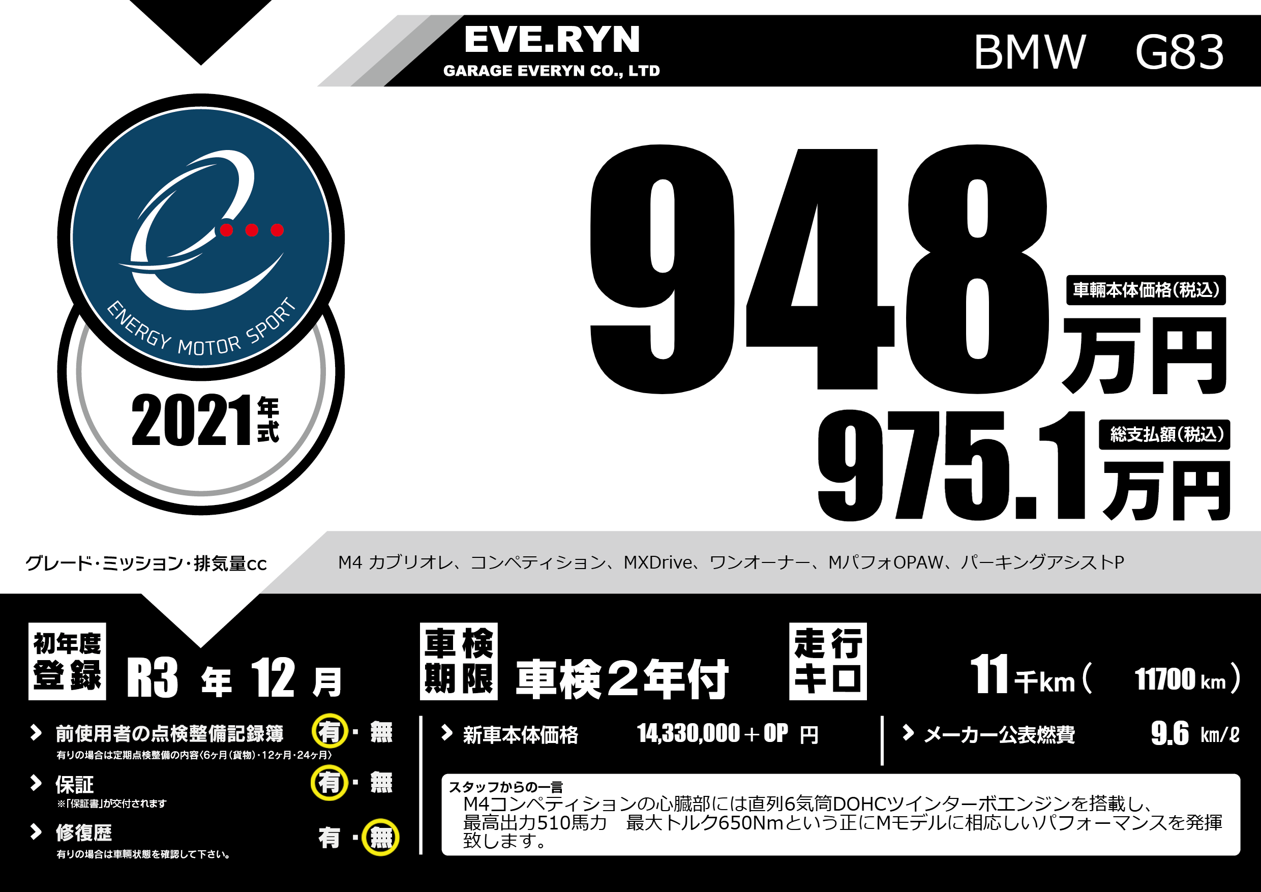 | 車名 | BMW G83 | グレード ミッション 排気量 |