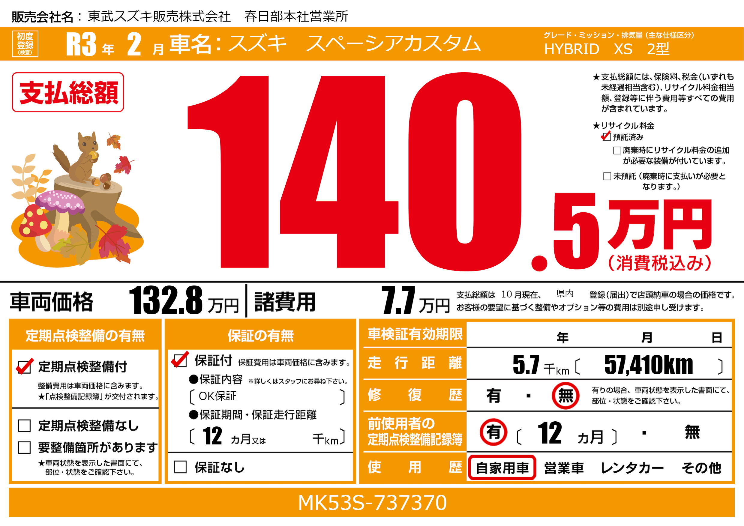 | 車名 | スズキ スペーシアカスタム | グレード ミッション 排気量 |